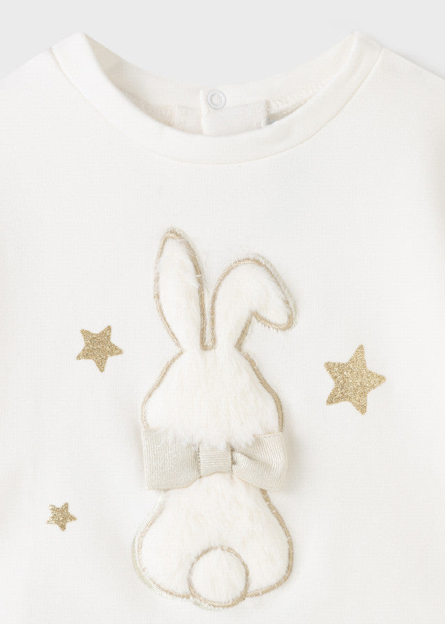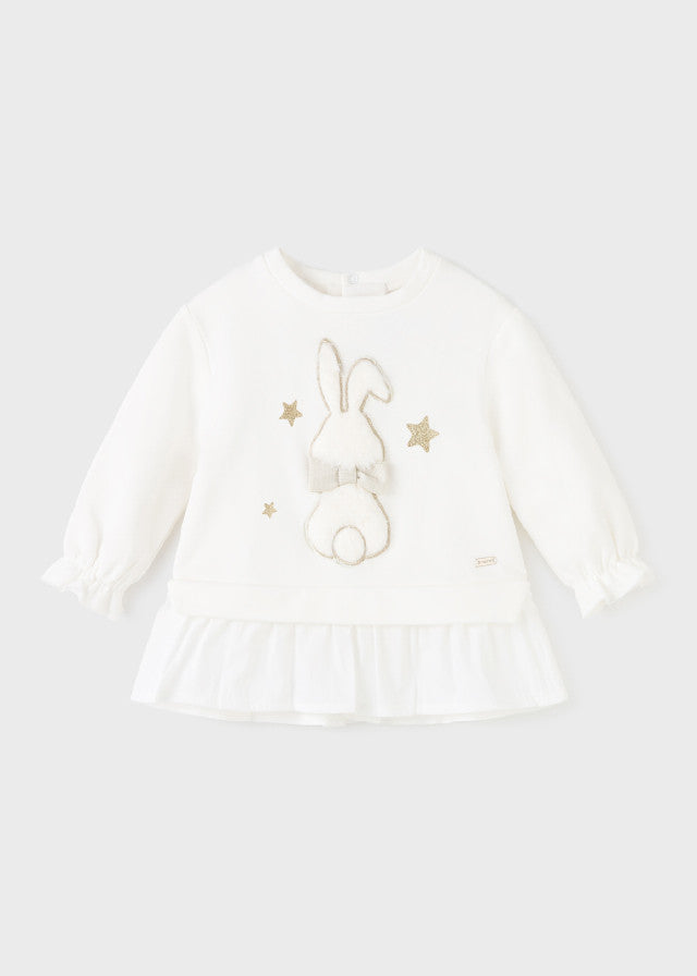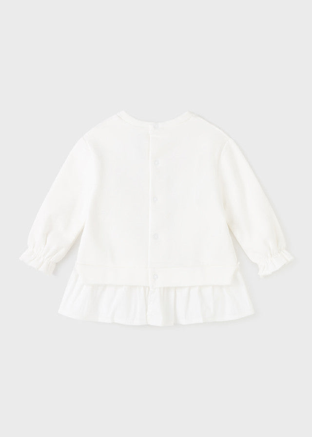 Langarm-Sweatshirt für Mädchen mit elastischen Bündchen. Rundhalsausschnitt. Verschluss mit Druckknöpfen auf der Rückseite, die die Passform des Kleidungsstücks erleichtern. Design mit dekorativer Rüsche unten.