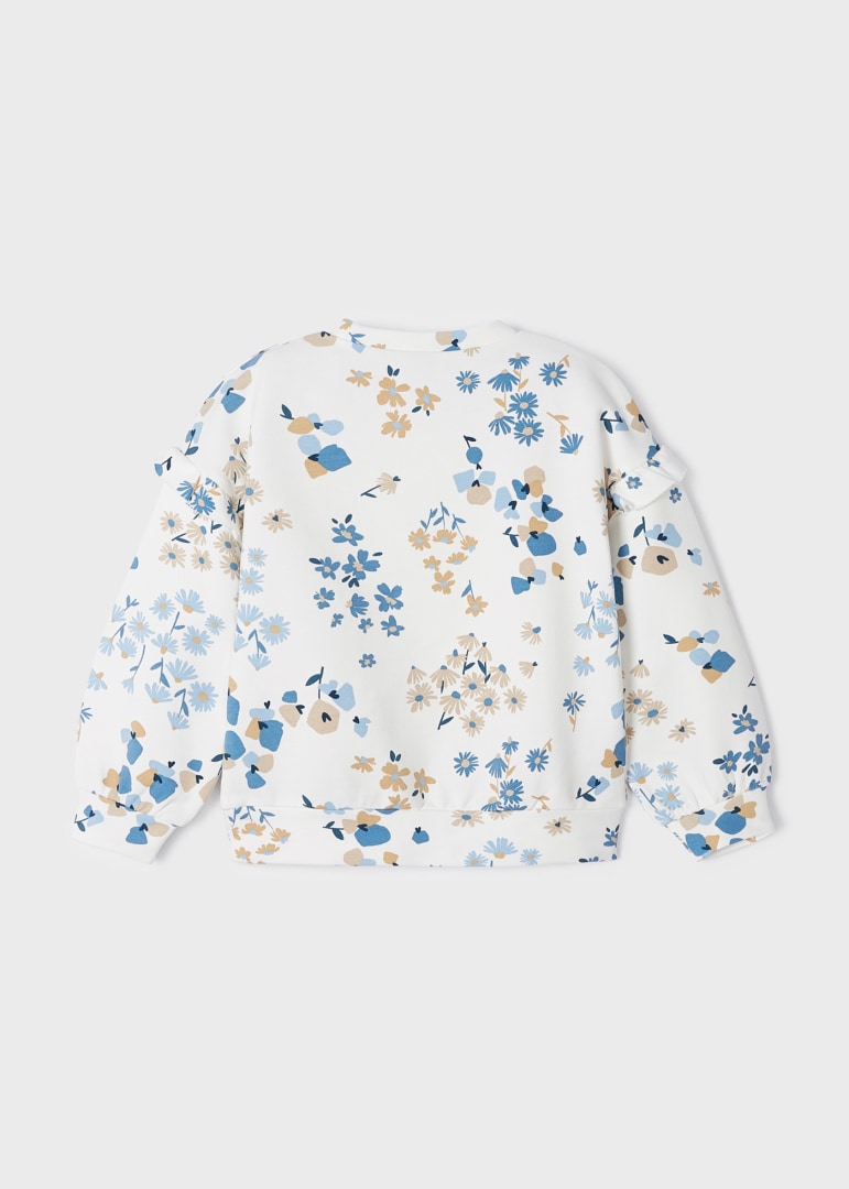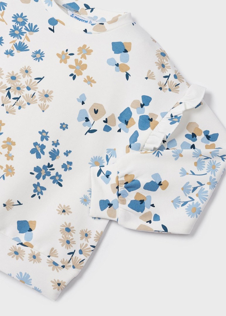 Langarm-Sweatshirt für Mädchen mit Rüschen an den Schultern. Rundhalsausschnitt. Druck mit Blumendekor.