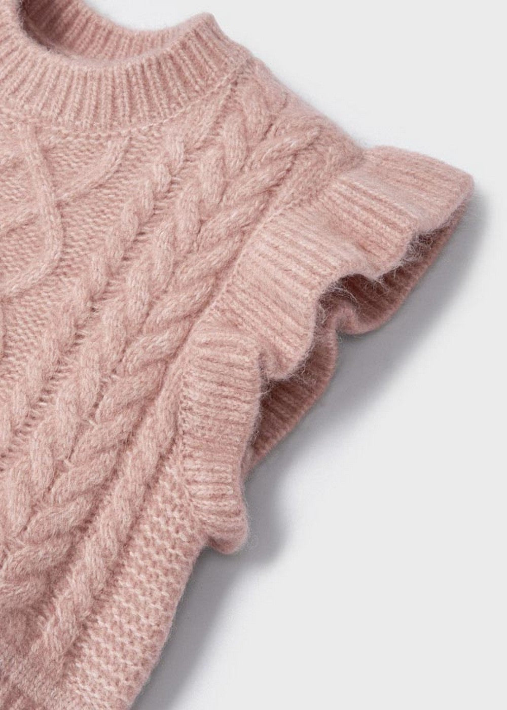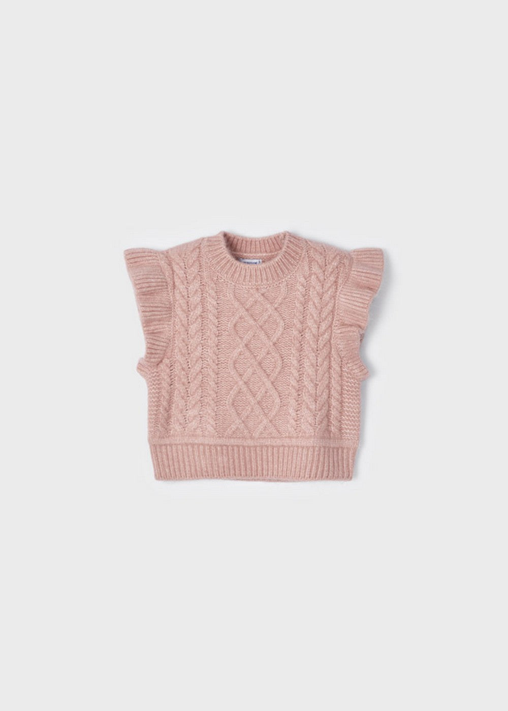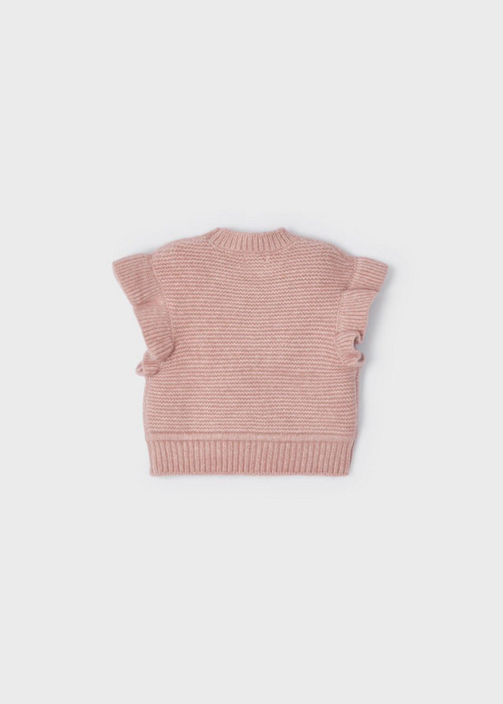Ärmellose Weste für Mädchen. Rundhalsausschnitt. Zierelemente: Zierrüschen. Außendesign mit Webeffekt.