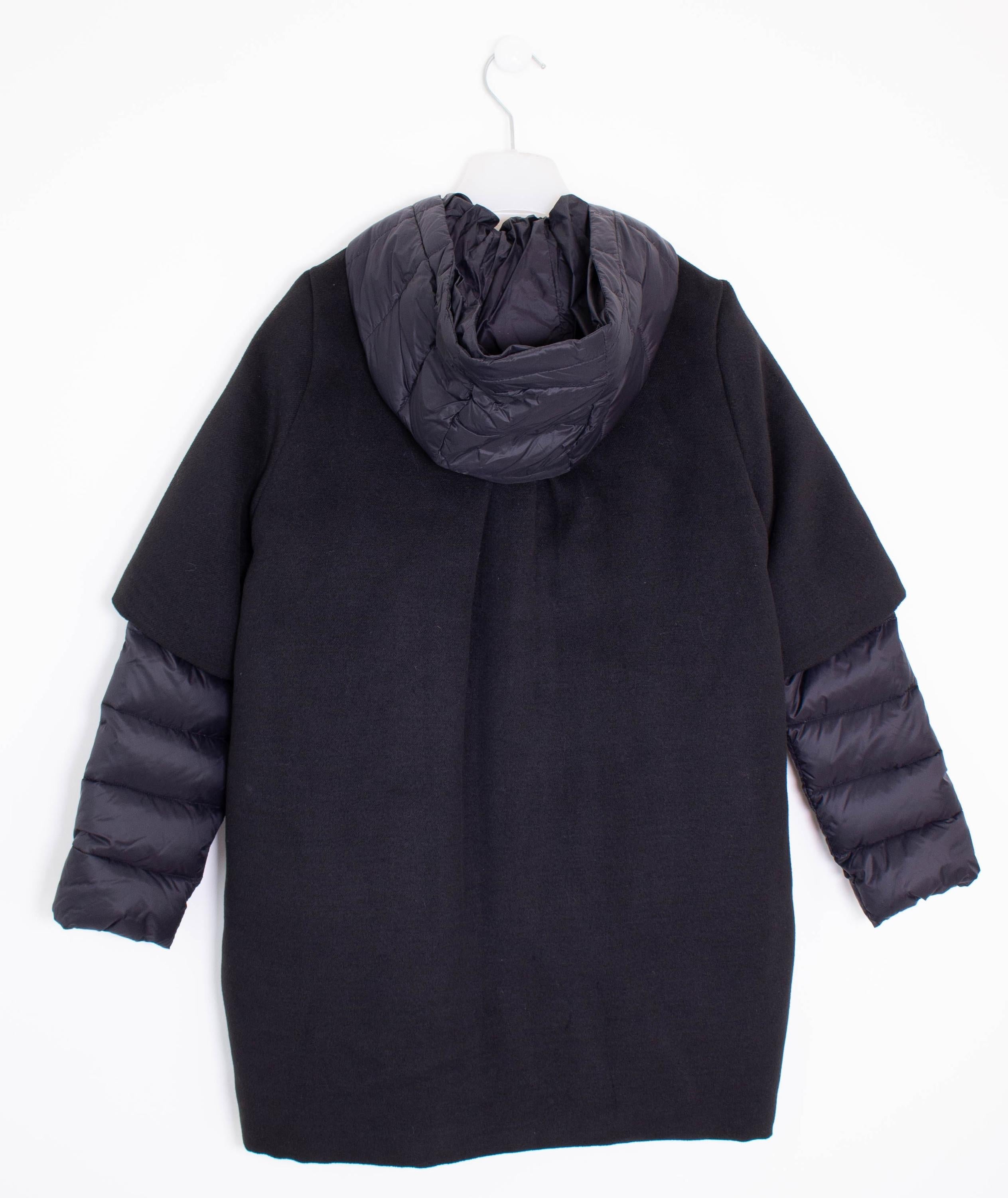 Einfarbige, schwarze, gesteppte Steppjacke mit darüberliegendem Mantel aus Stoff mit halben Ärmeln.