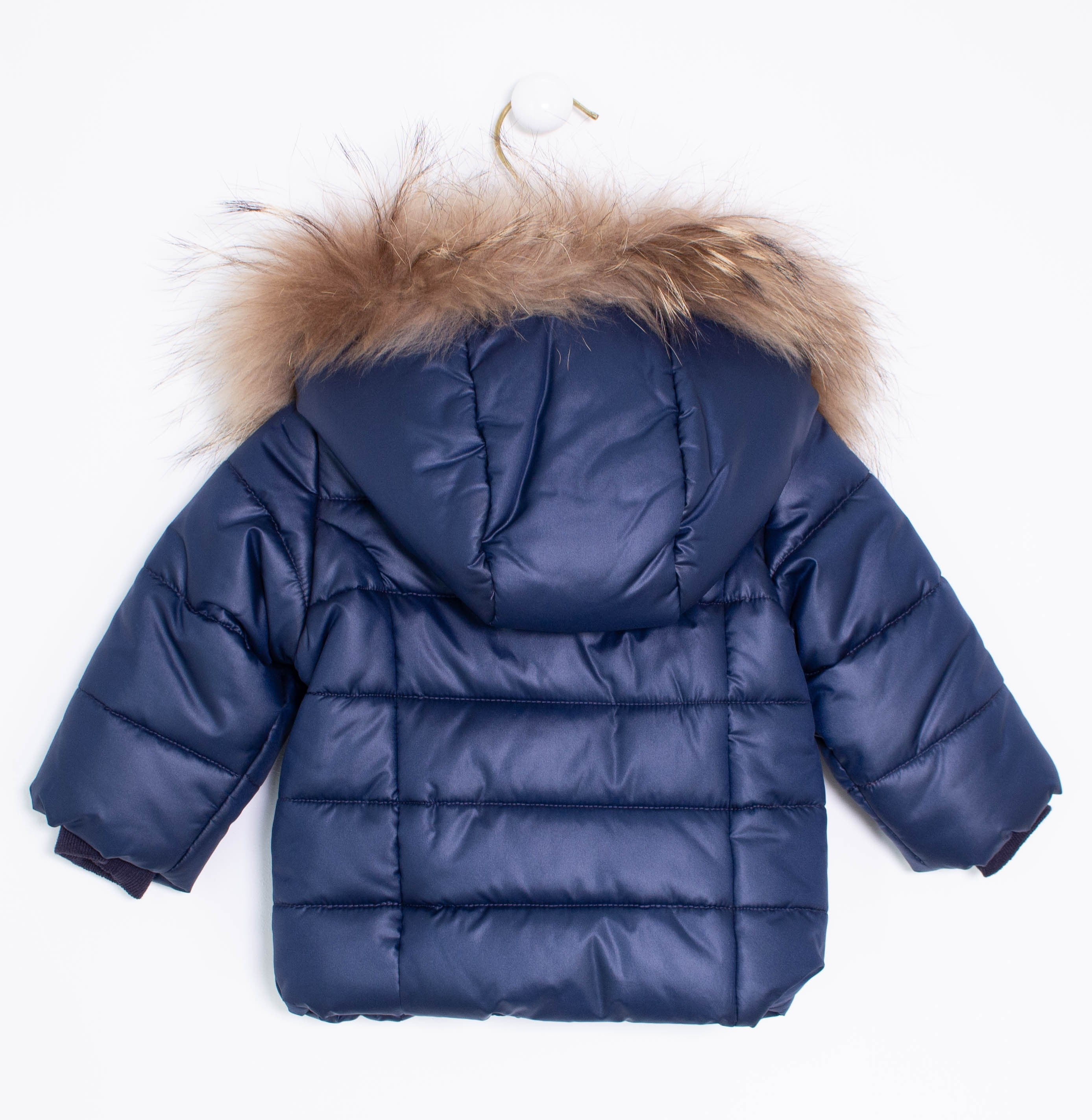 Gefütterte Jacke mit Kapuze mit originalem einfarbigem blauem Fell mit Reißverschluss und Froschverschluss
