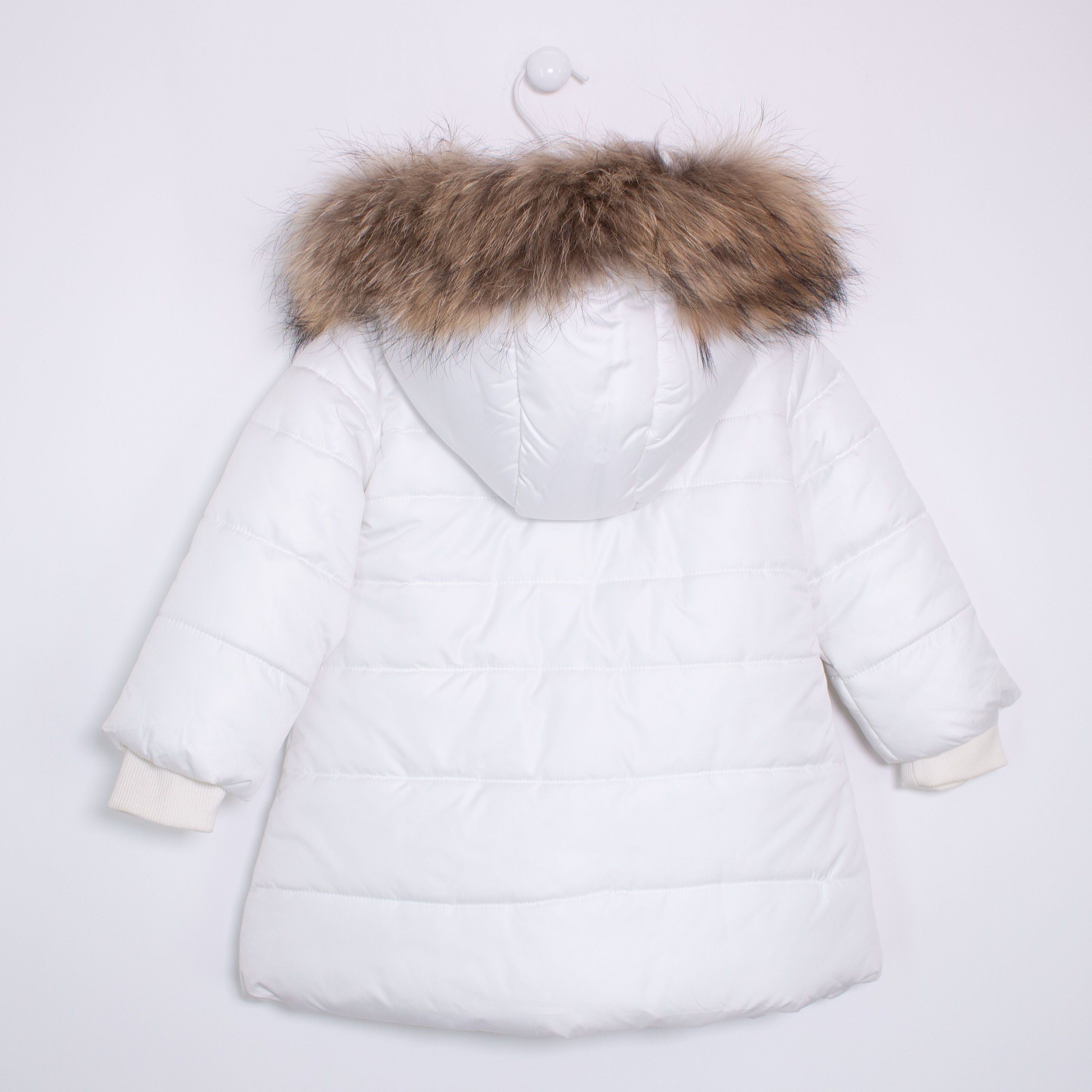 Lange Jacke mit Kapuze und originellen Fellbommeln
