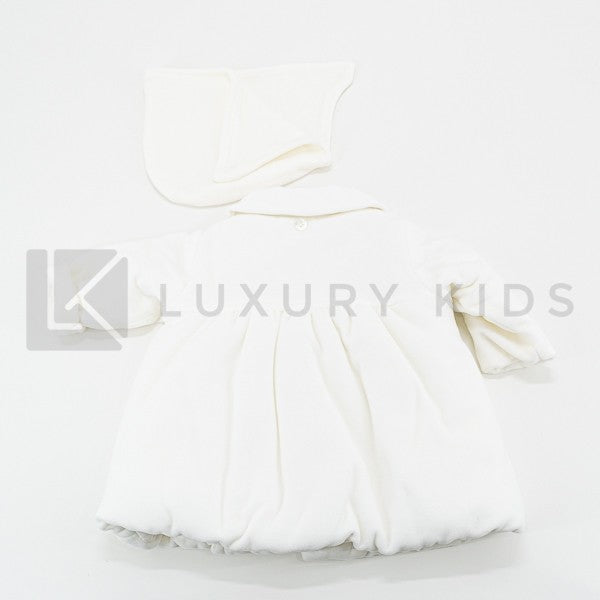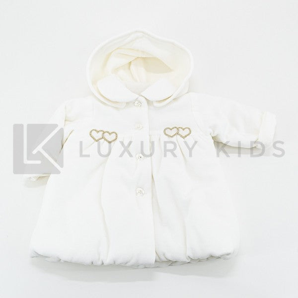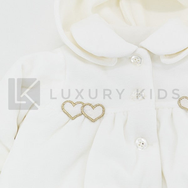 Ausgestellte Jacke aus weicher Chenille mit abnehmbarer cremefarbener Kapuze mit Herzapplikation auf der Brust.