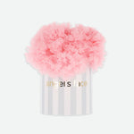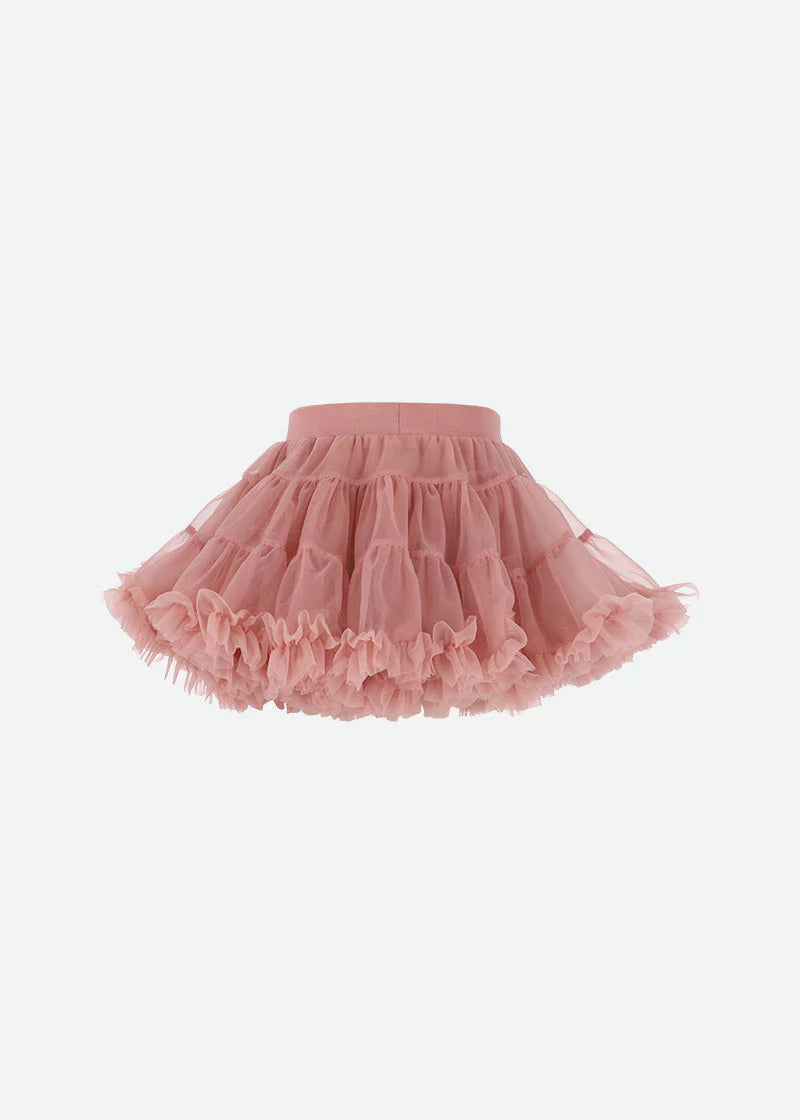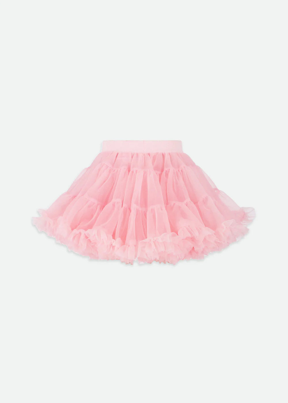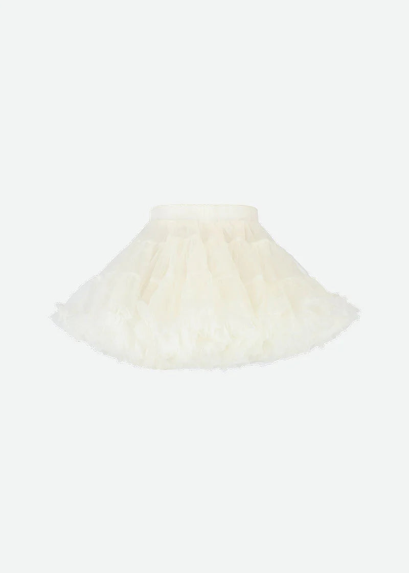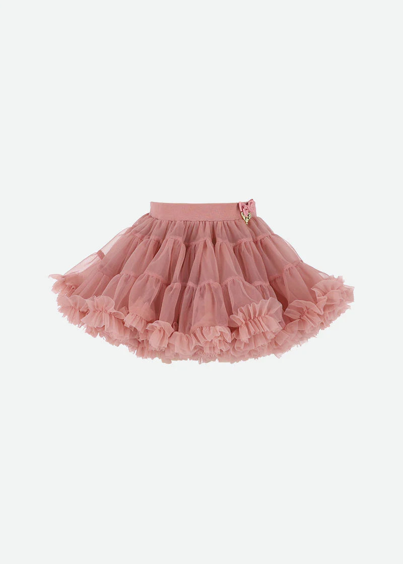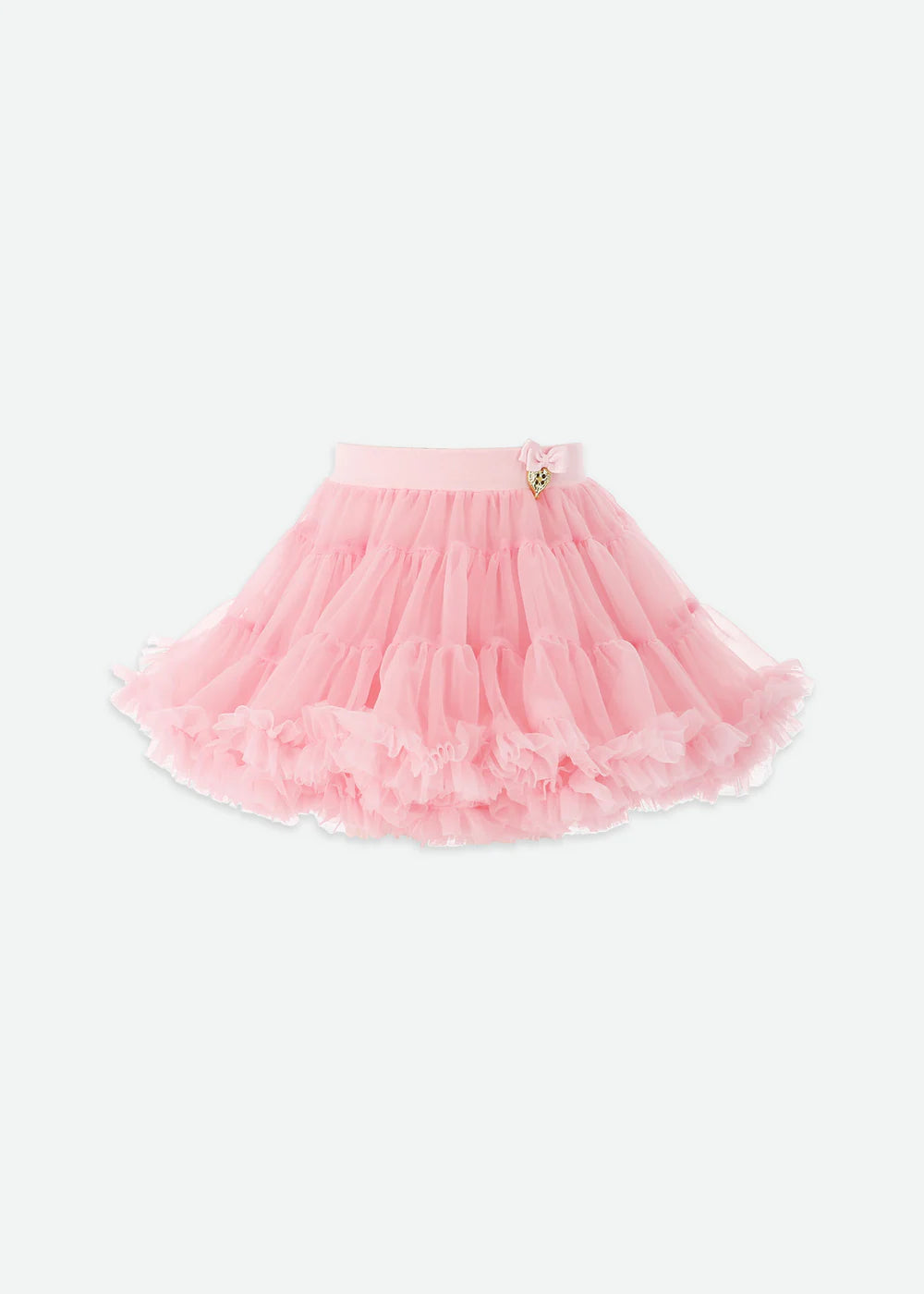 Angel's Face Ikonisches Tutu für Babys. Der Rock ist in einem weichen, elastischen Bund gerafft und vollständig mit einer bequemen Baumwollmischung gefüttert. Schichten aus weichem Tüll und Volants sorgen für Volumen und Sprungkraft, ergänzt durch unsere charakteristische goldene herzförmige Schleife und unseren Anhänger in der Taille.