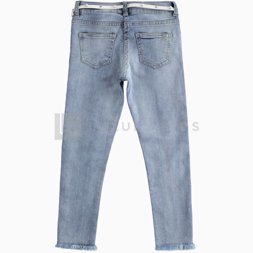 Sarabanda-Hose aus Stretch-Denim mit Spitze an den Rissen. Das Modell ist schmal geschnitten mit verstellbarer Taille. Die Unterseite des Beins ist ausgefranst. Die Hose ist mit einem Kunstledergürtel mit Perlen und Strassnieten ausgestattet