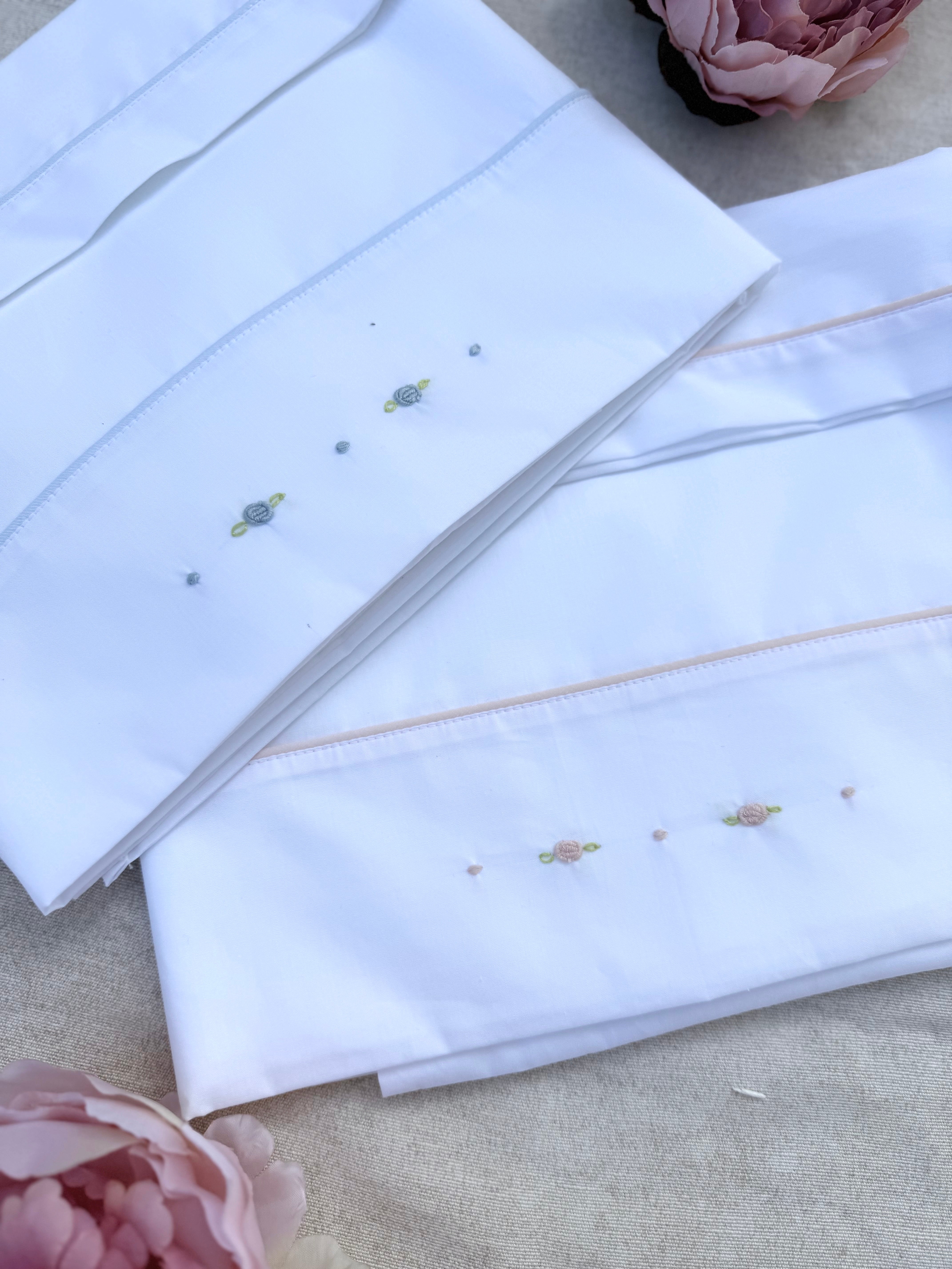 Questo lenzuolino per carrozzina in cotone è perfetto per il tuo neonato. Comprende fodera e coprimaterasso, in morbido cotone bianco con incantevoli ricami di rosselline a mano in rosa o celeste. Garantisce il massimo comfort e stile per il tuo bebè.