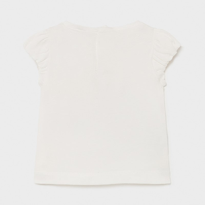 Pullover aus Bio-Baumwolle mit halben Ärmeln und Puffärmeln und cremefarbenem Gummiband. Bonbondruck mit Tüll auf der Vorderseite.