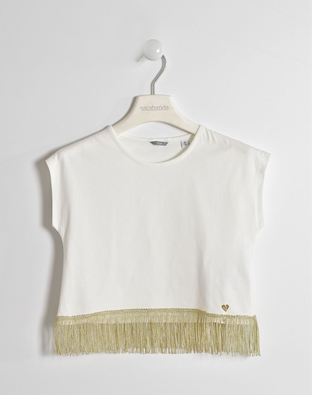 Pullover aus Stretch-Baumwolle mit halben Ärmeln und GOLDfarbenen Fransen an der Unterseite
