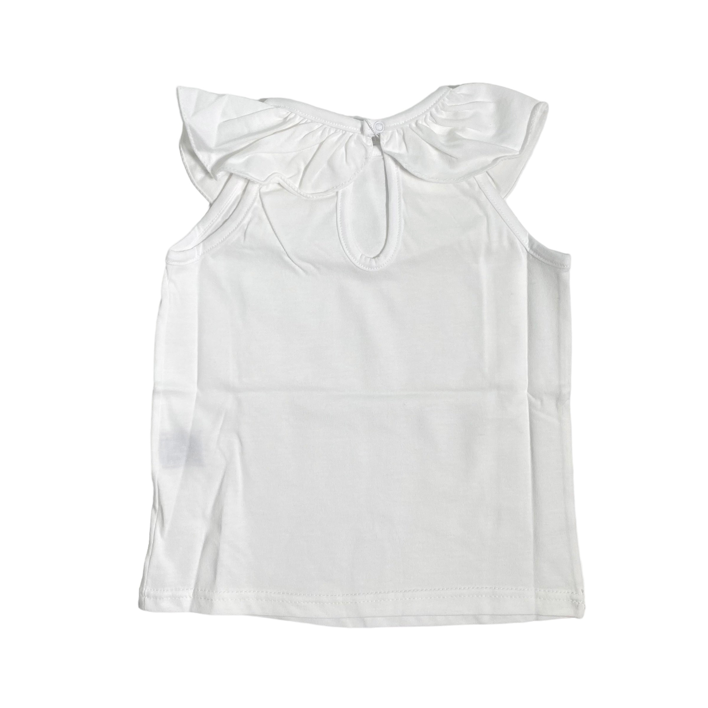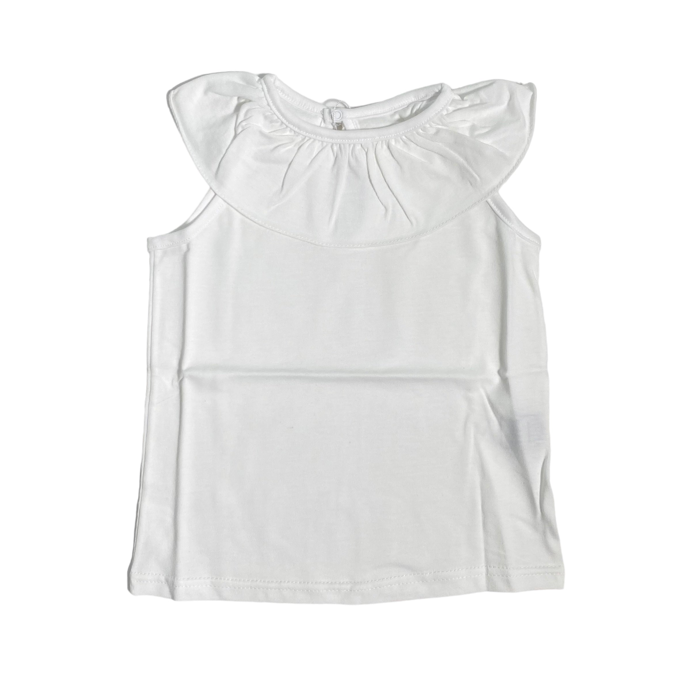 Weißes ärmelloses Hemd mit schöner Rüsche am Kragen. Öffnung auf der Rückseite des Kragens mit einem kleinen Knopf.