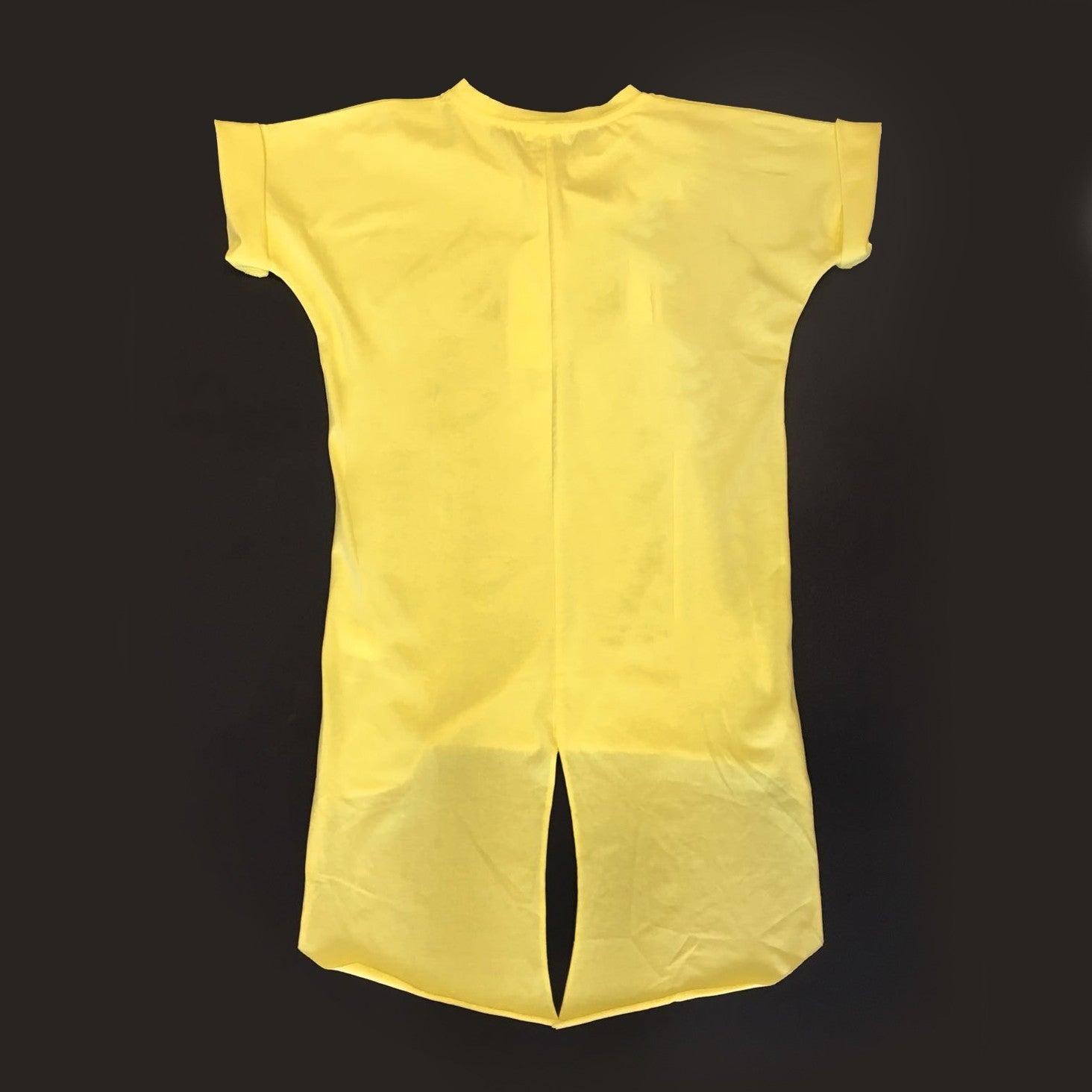 Gelbes Maxi-T-Shirt aus Baumwolle mit Aufdruck und Steinapplikationen auf der Brust
