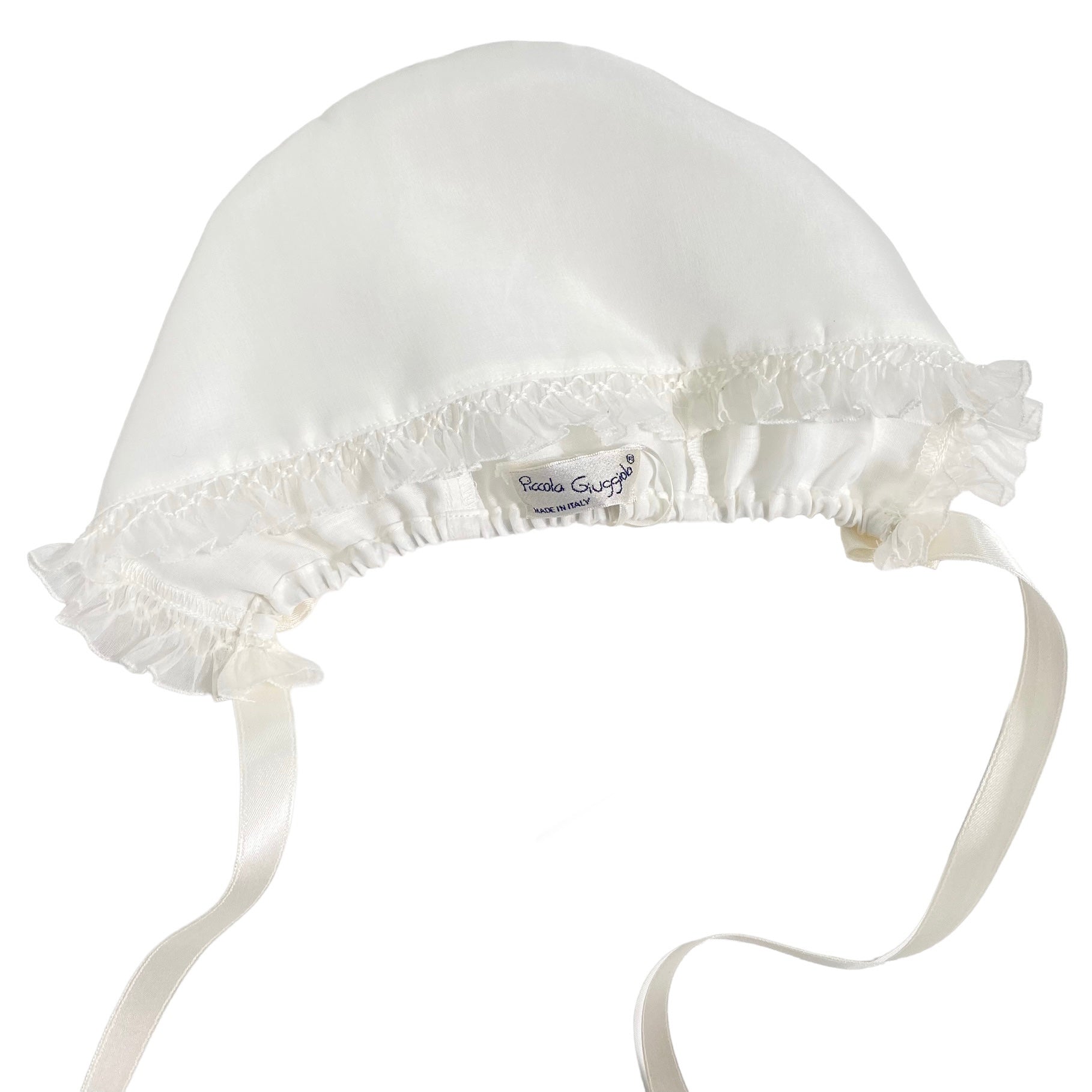 Passende Mütze aus Seidenorgandis, mit Satinbandverschluss,