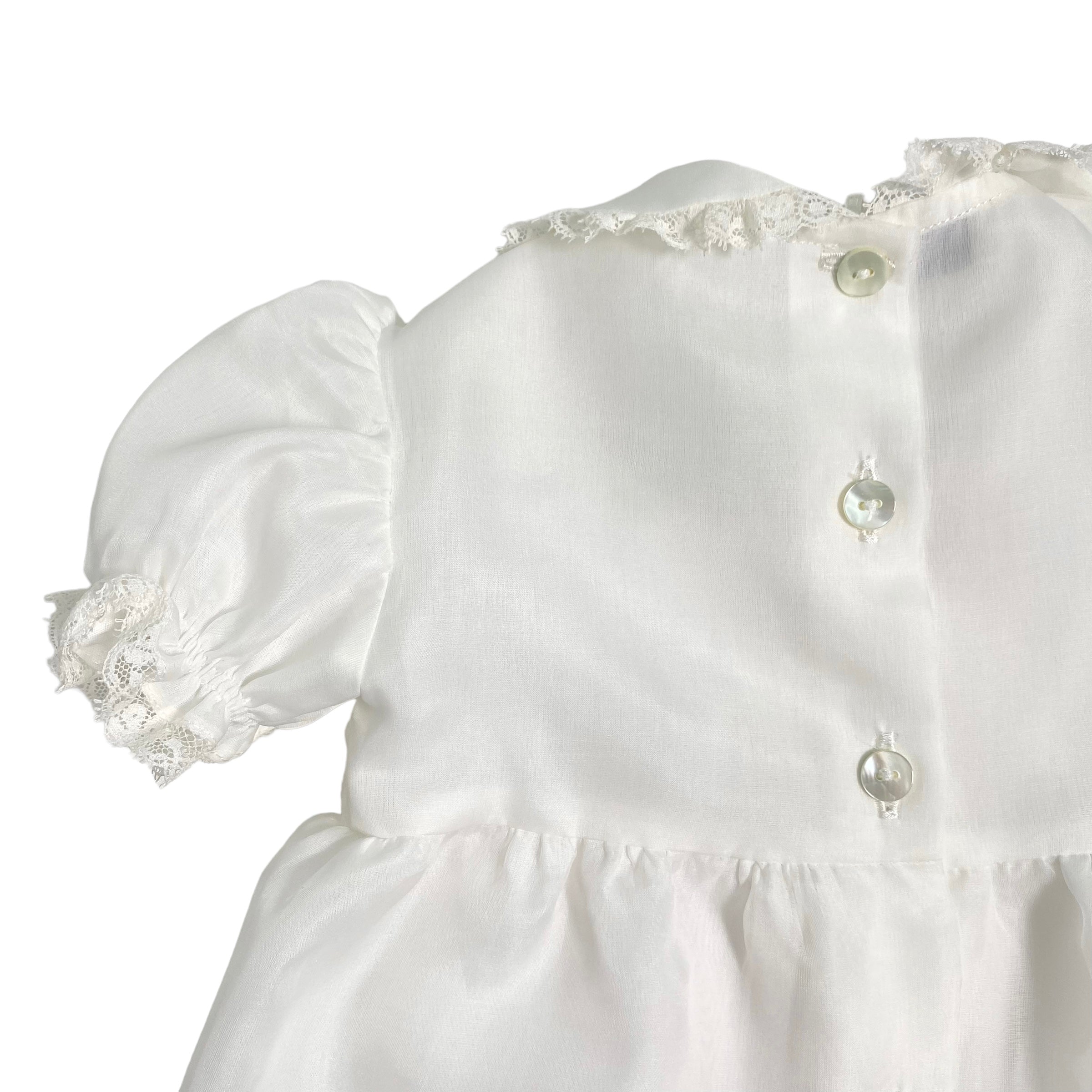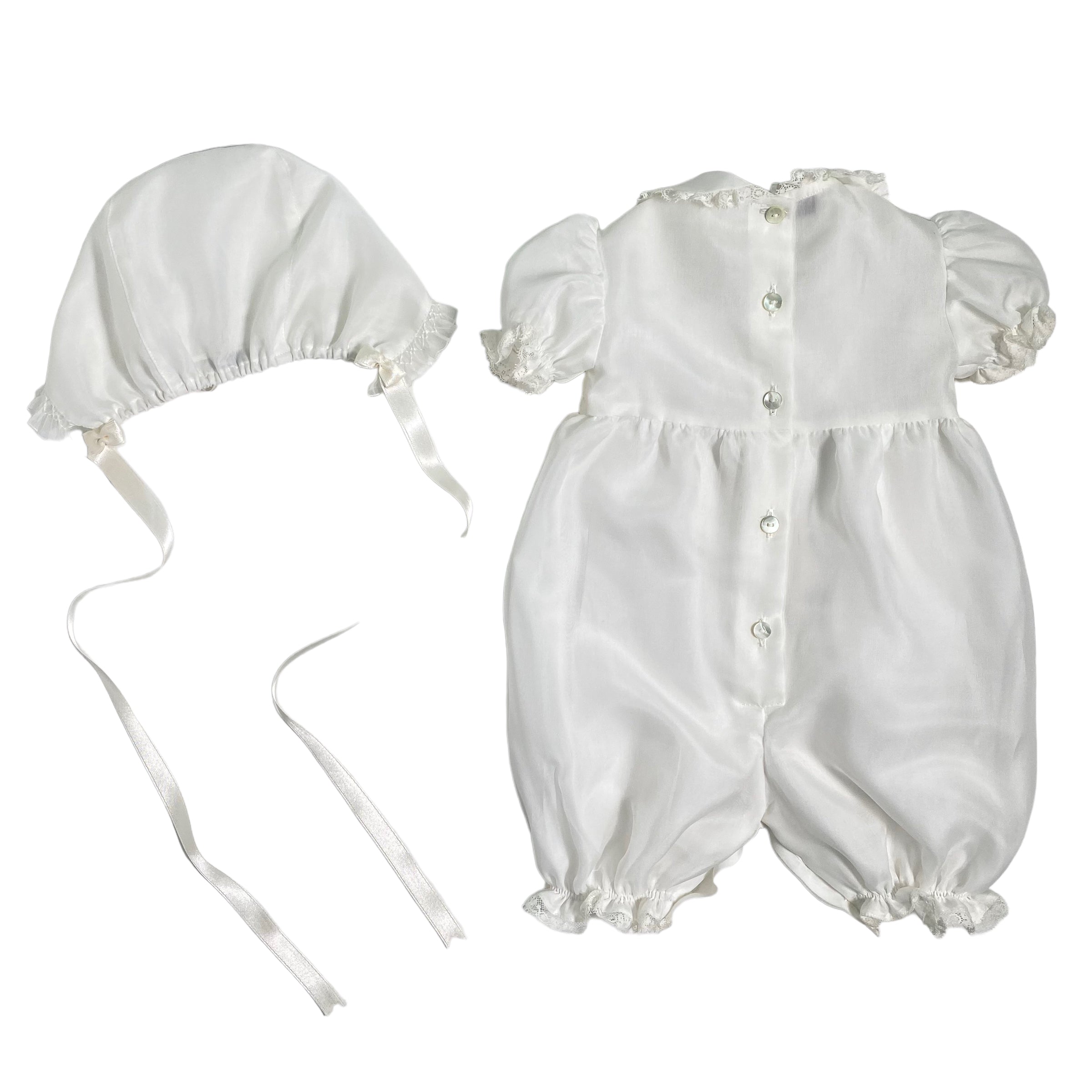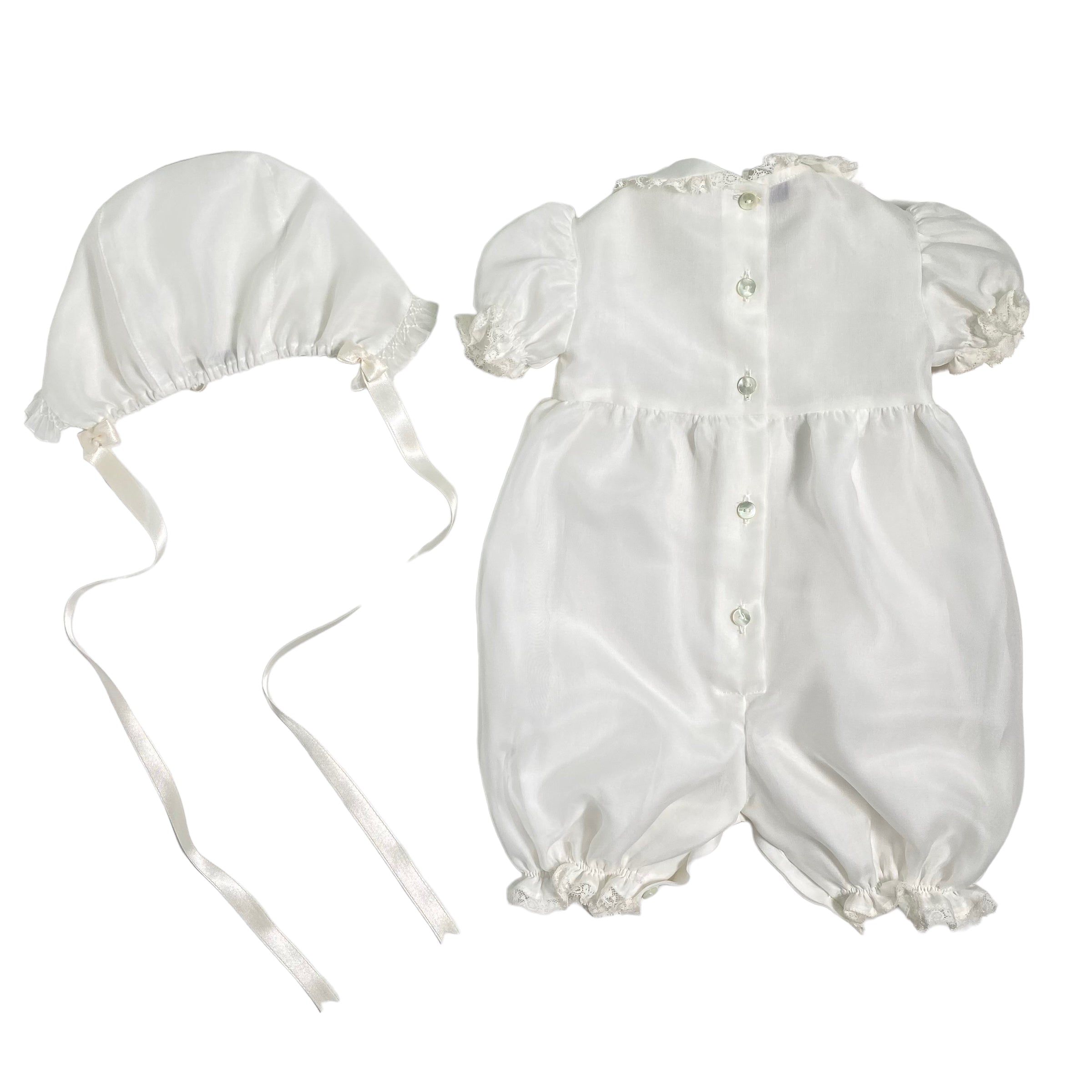 Eleganter Taufstrampler aus Seidenorgandis und Spitze, mit Rundkragen, Puffärmeln, Verarbeitung am Oberteil und zentraler Schleife vorne.