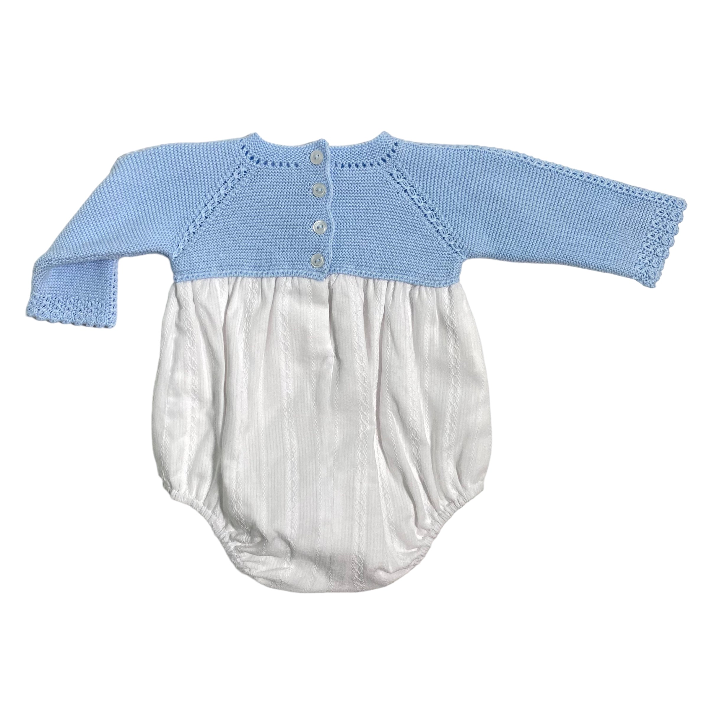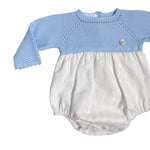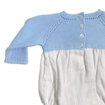 Pagliaccetto combinato manica lunga, con parte superiore in filo di cotone celeste e parte inferiore in tessuto bianco lavorato.