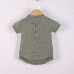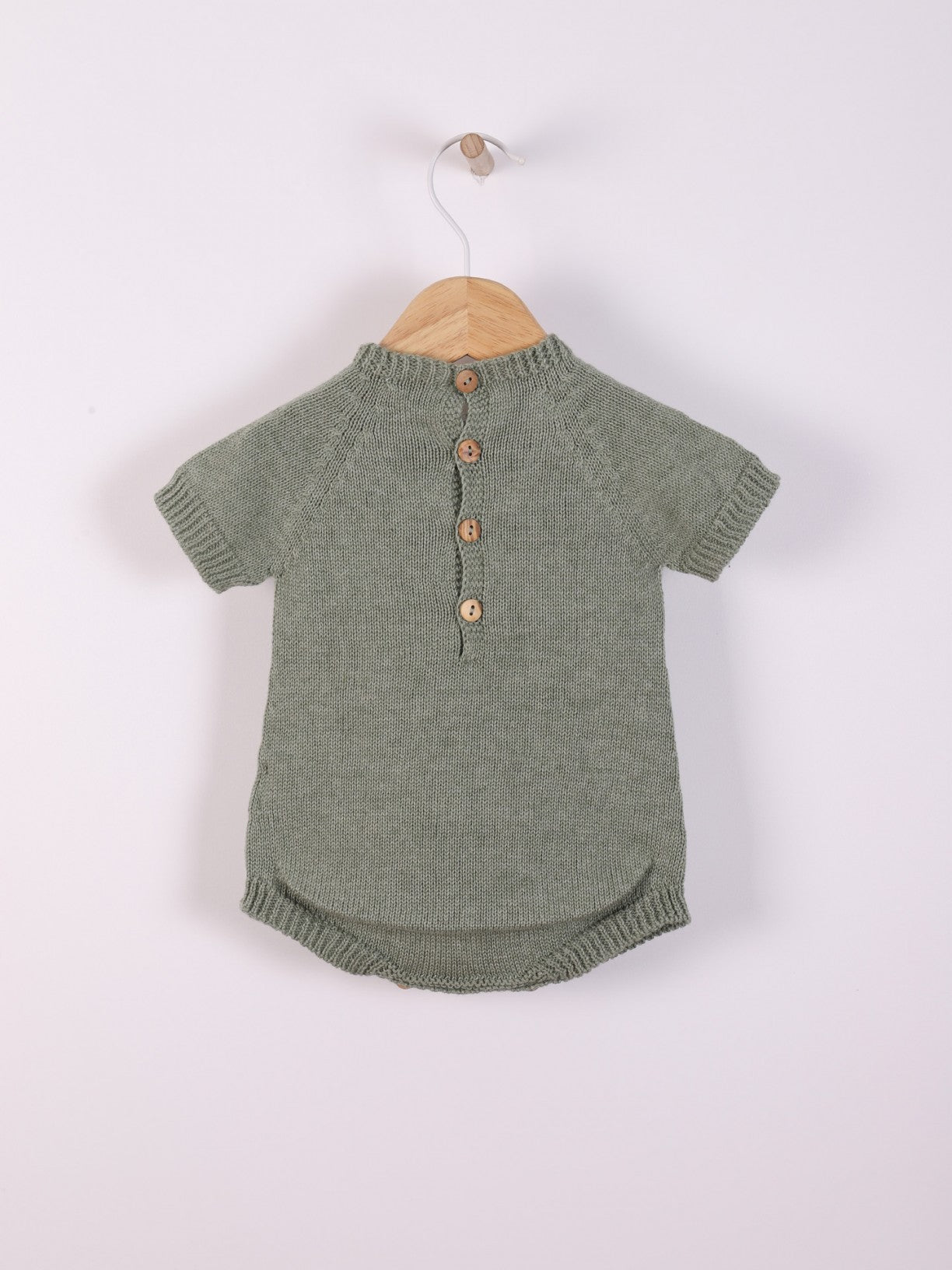 Pagliaccetto lavorato a maglia in morbido e traspirante cotone biologico, ideale per neonati maschi e femmine. Pagliaccetto a maniche corte SUMMER IN THE VILLAGE con chiusura posteriore e tra le gambe con bottoni in legno. Prodotto in Wholegarment, pezzo unico senza cuciture, per il massimo comfort del tuo bambino.