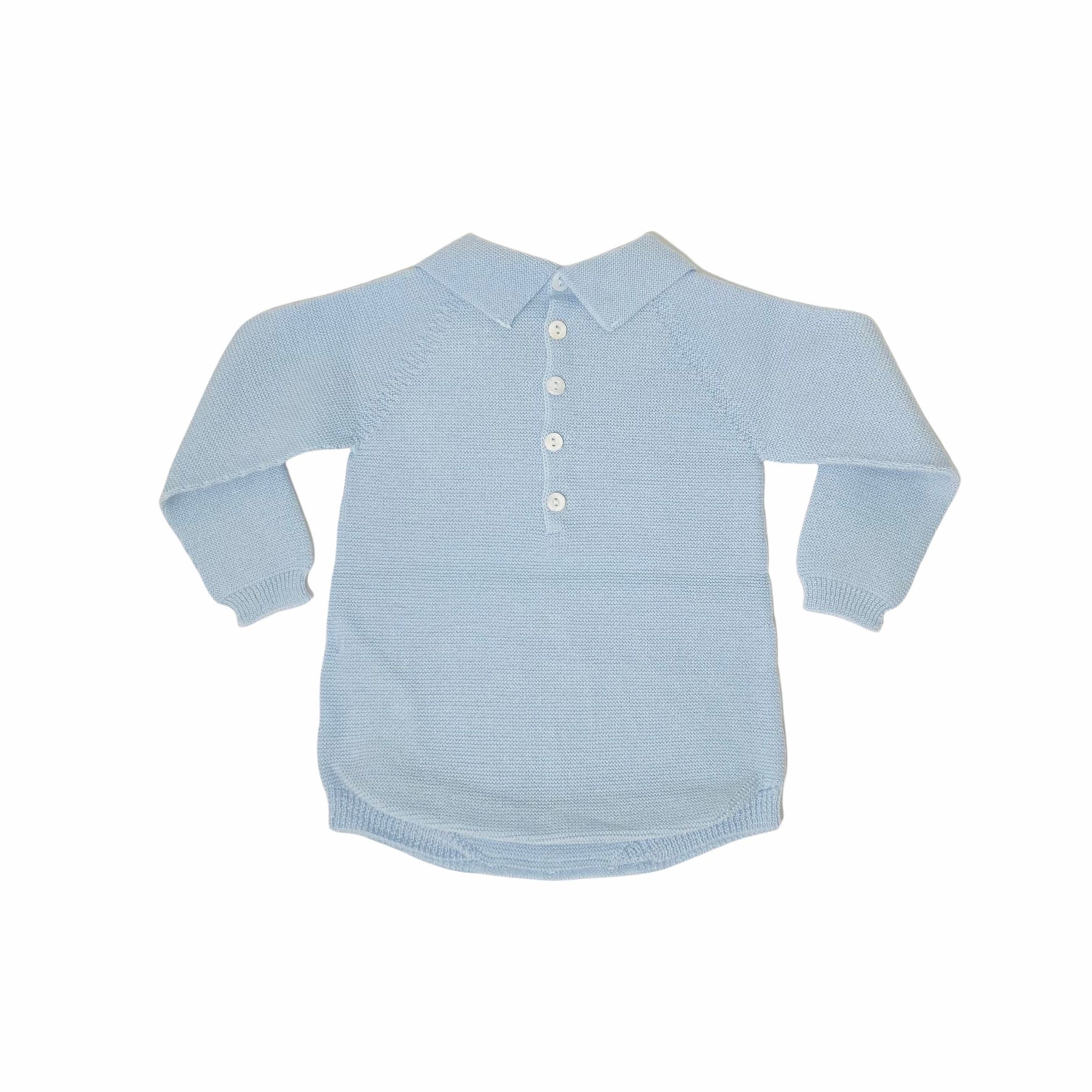 Strampler aus 100 % Wolle, weich und warm, mit Kragen, langen Ärmeln, Verschluss auf der Rückseite und im Schritt mit zarter Stickerei auf der Vorderseite.
