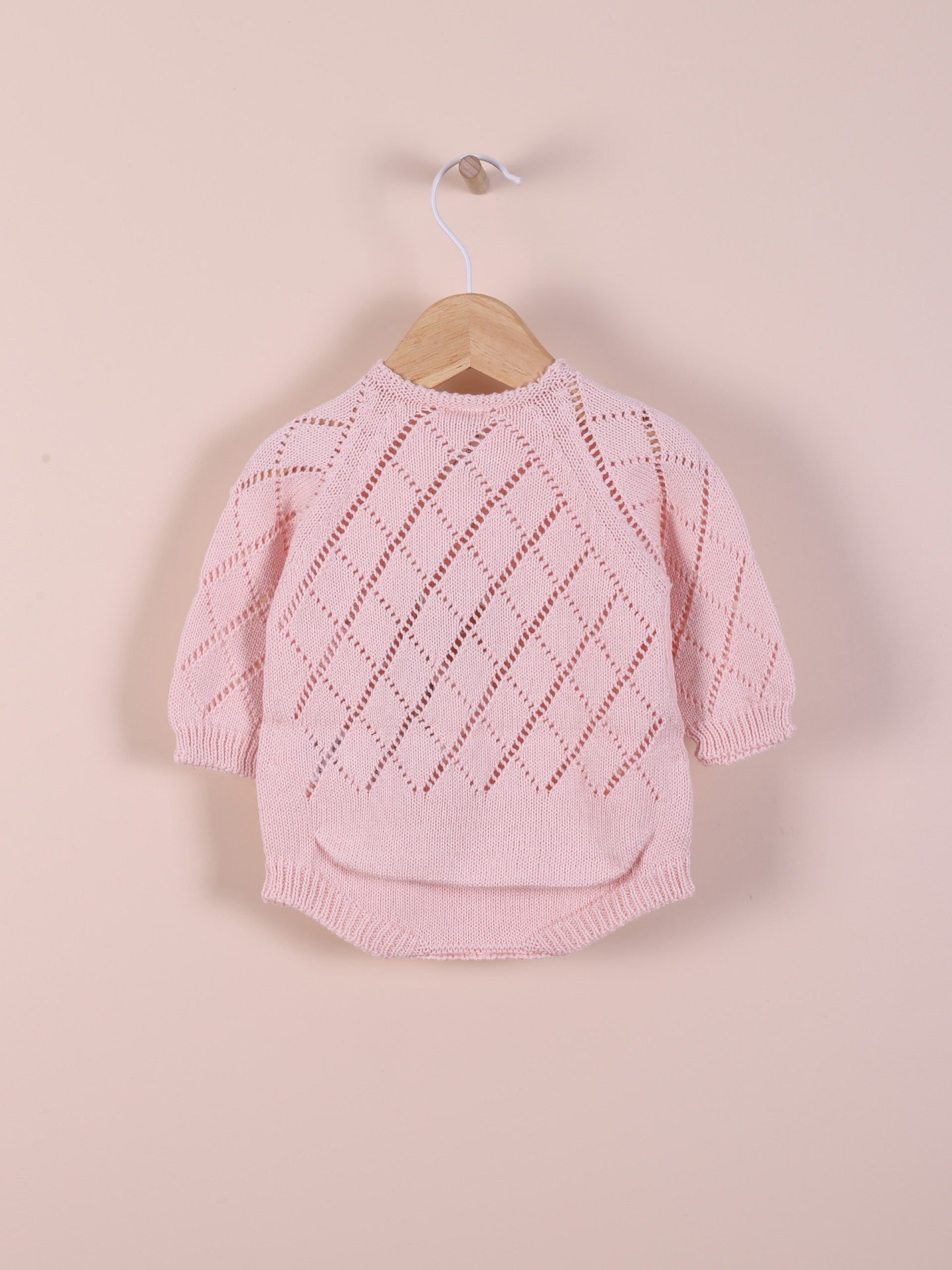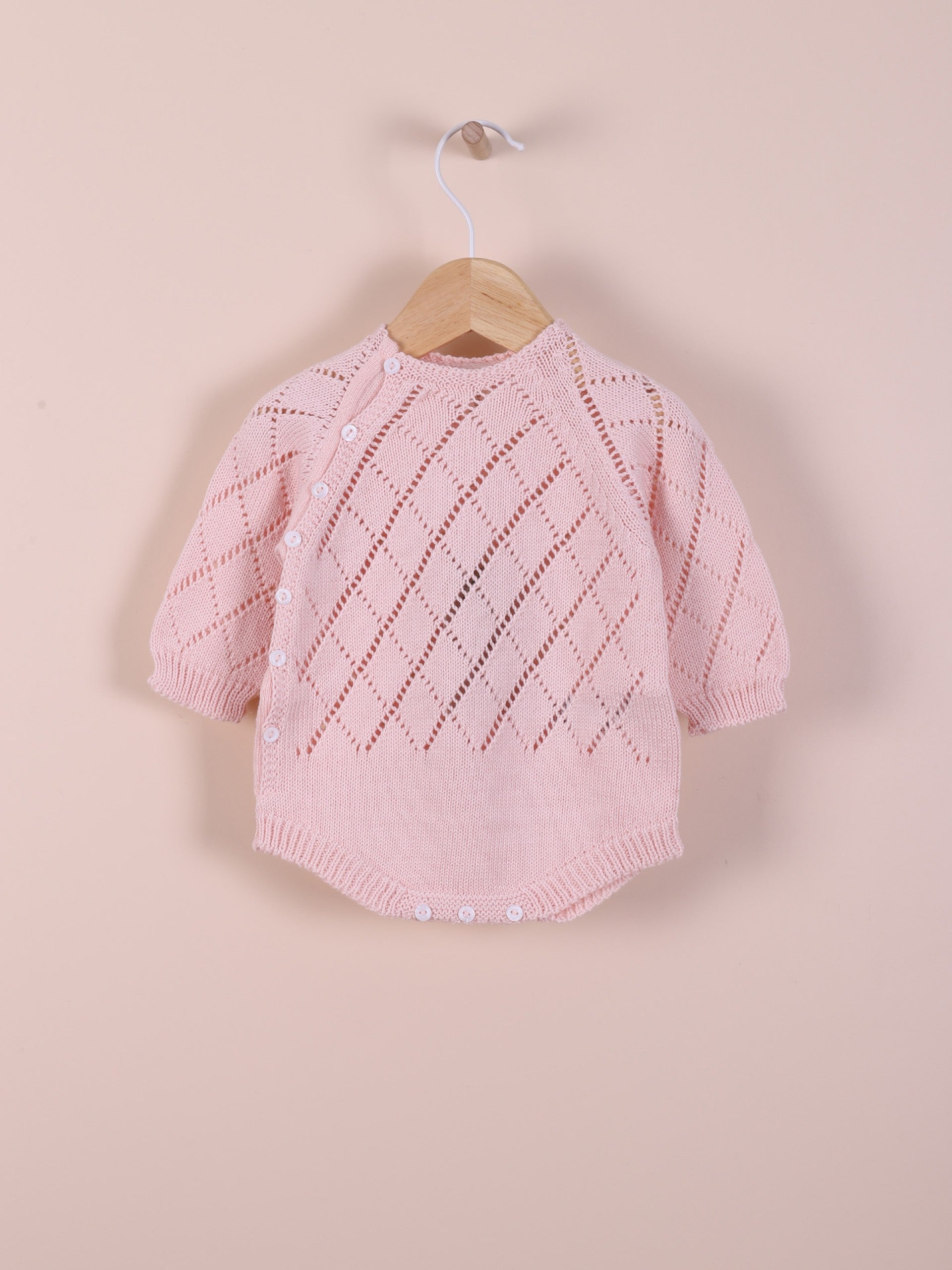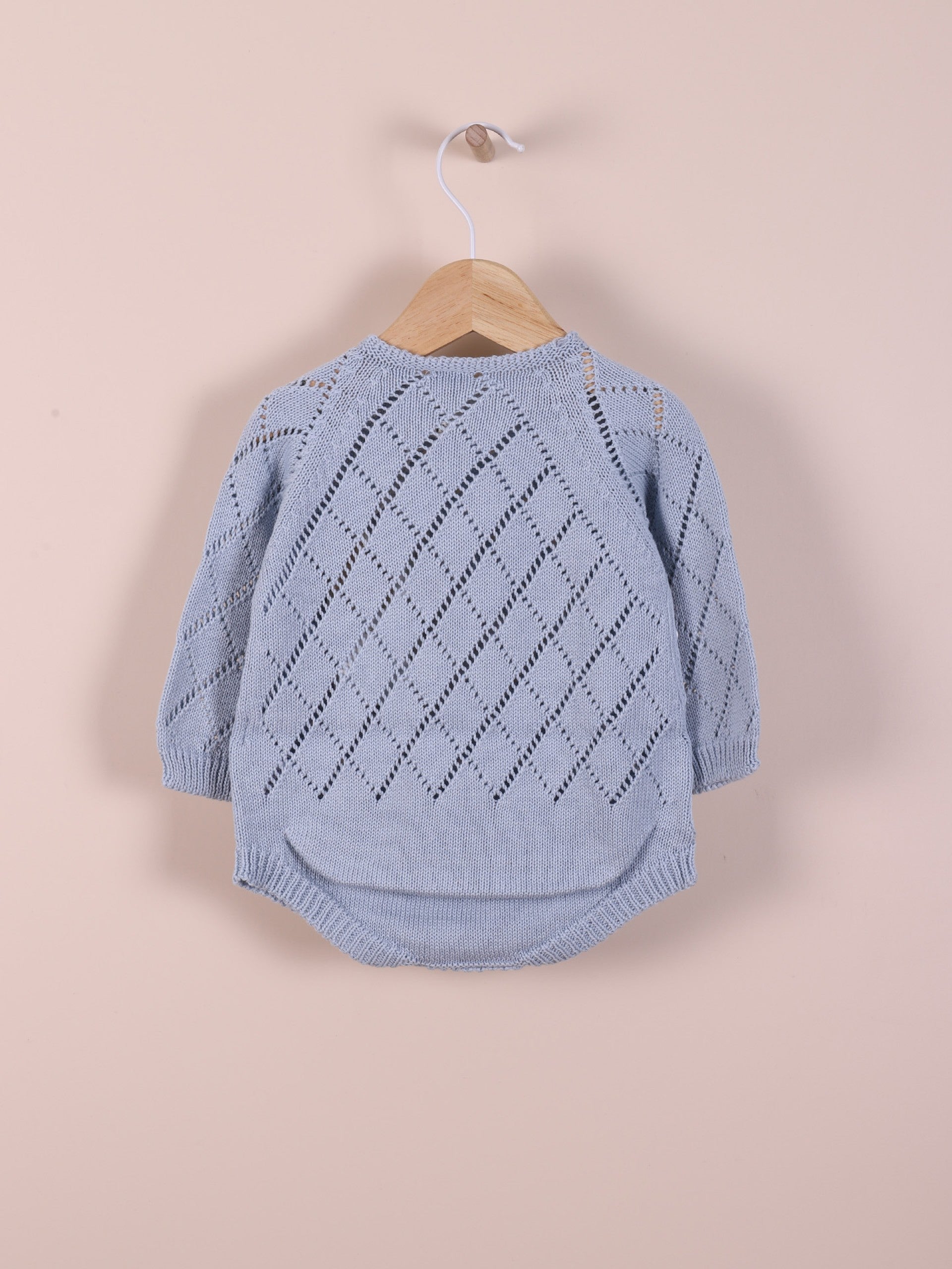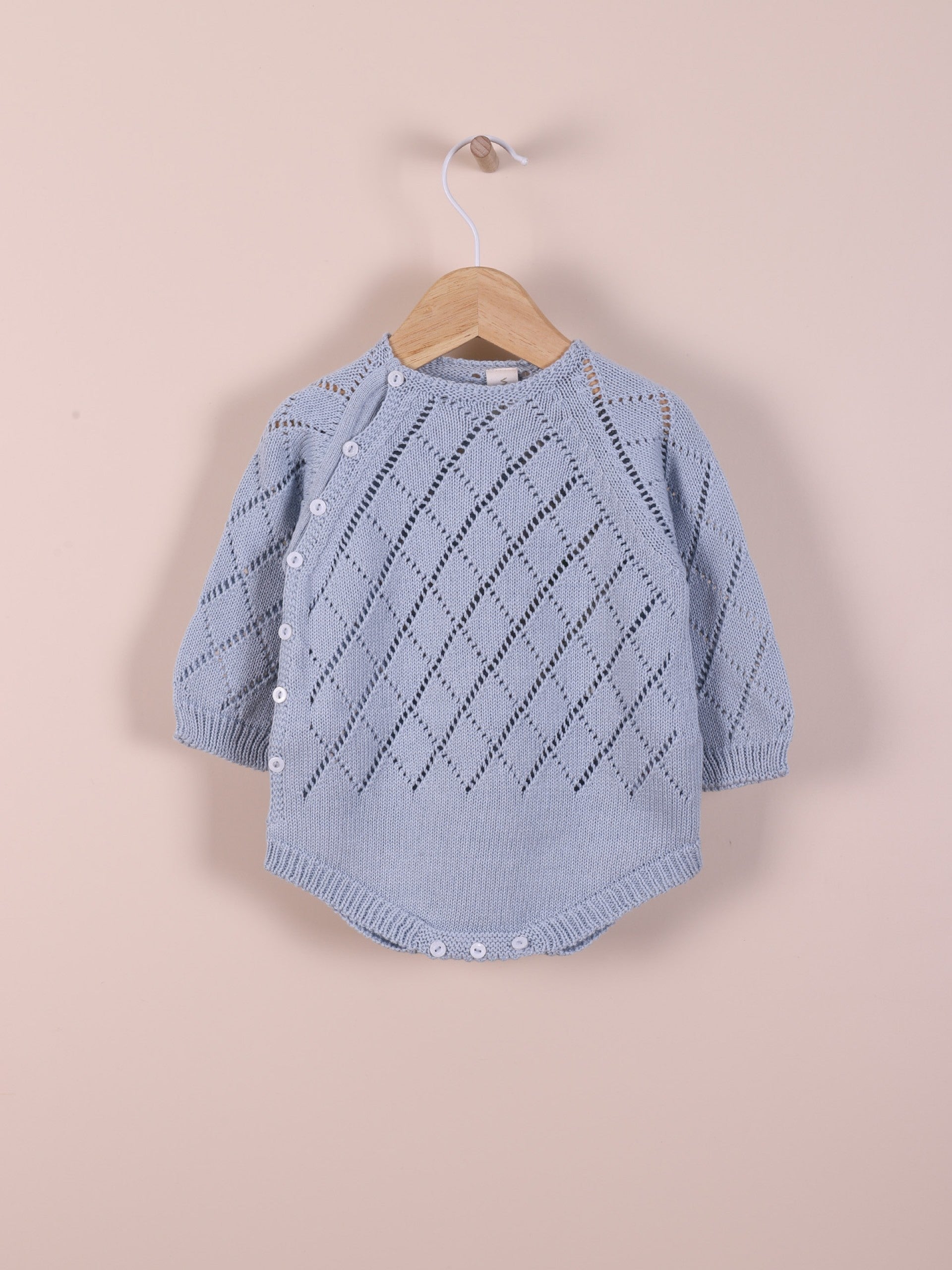 Scopri l'incantevole shorty lavorato a maglia in cotone biologico, un'opzione morbida e traspirante, perfetta per i neonati, sia maschi che femmine, fino a 24 mesi. Il pantaloncino a maniche lunghe PURE si distingue per il colletto in maglia e si allaccia sul retro e tra le gambe con bottoni in madreperla, offrendo praticità e un tocco elegante. Realizzato con la tecnologia Wholegarment, questo capo è privo di cuciture per il massimo comfort del tuo bambino.