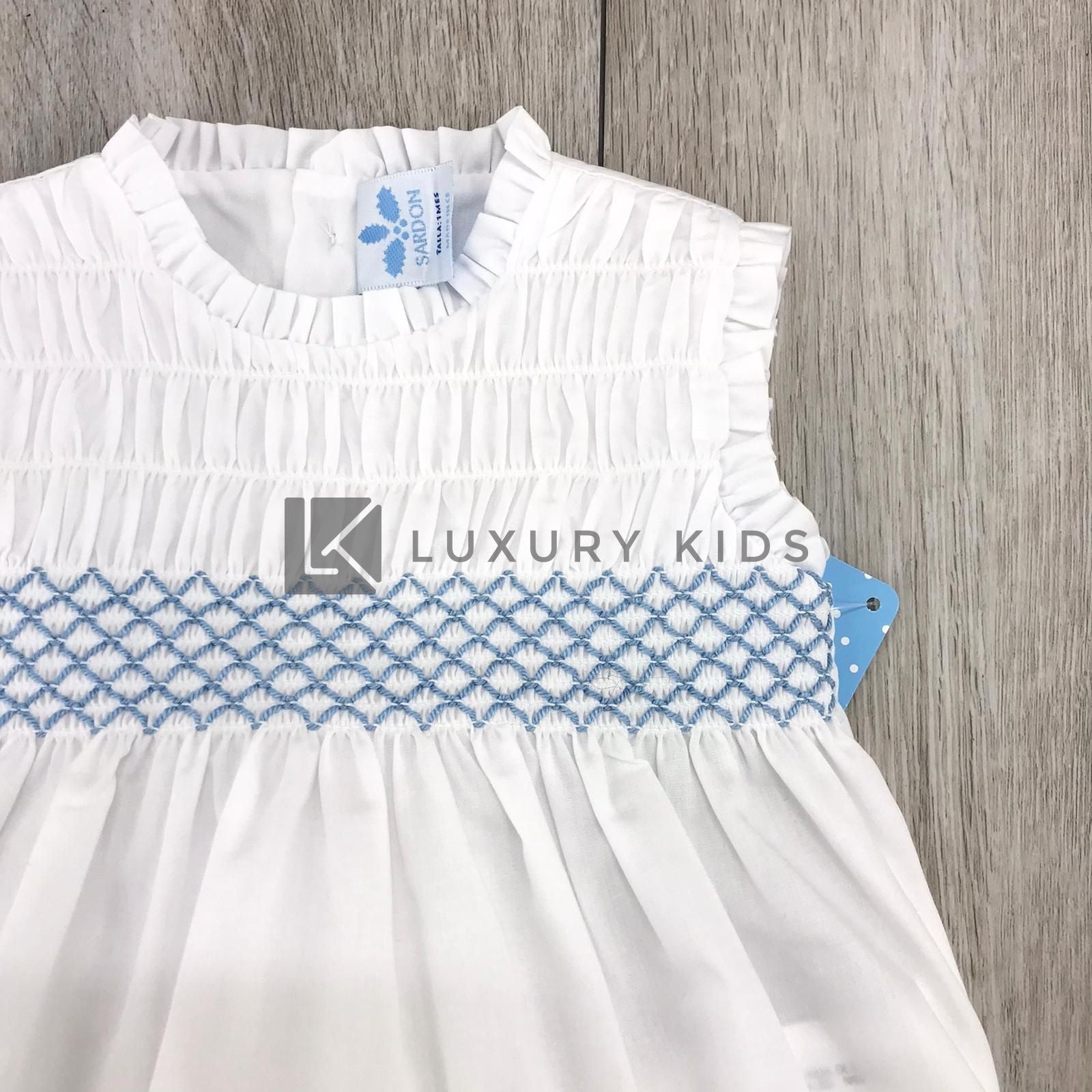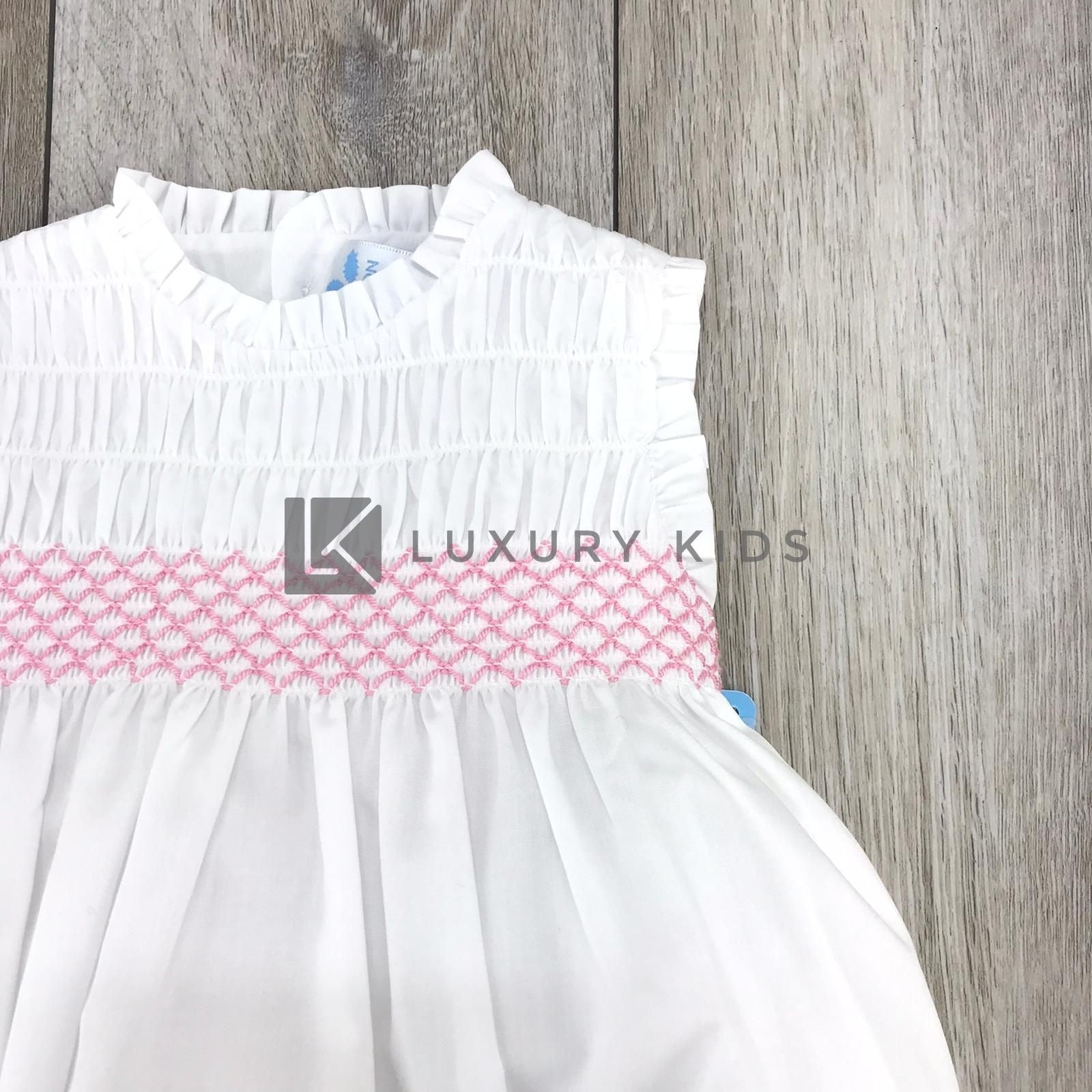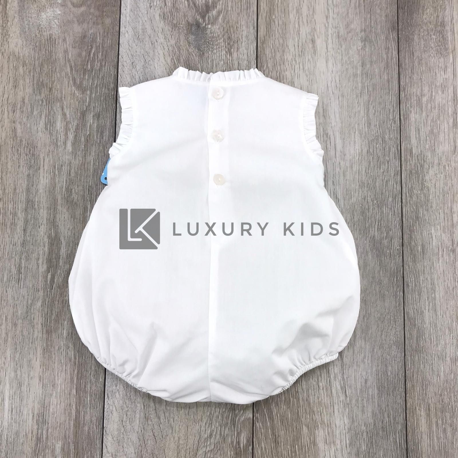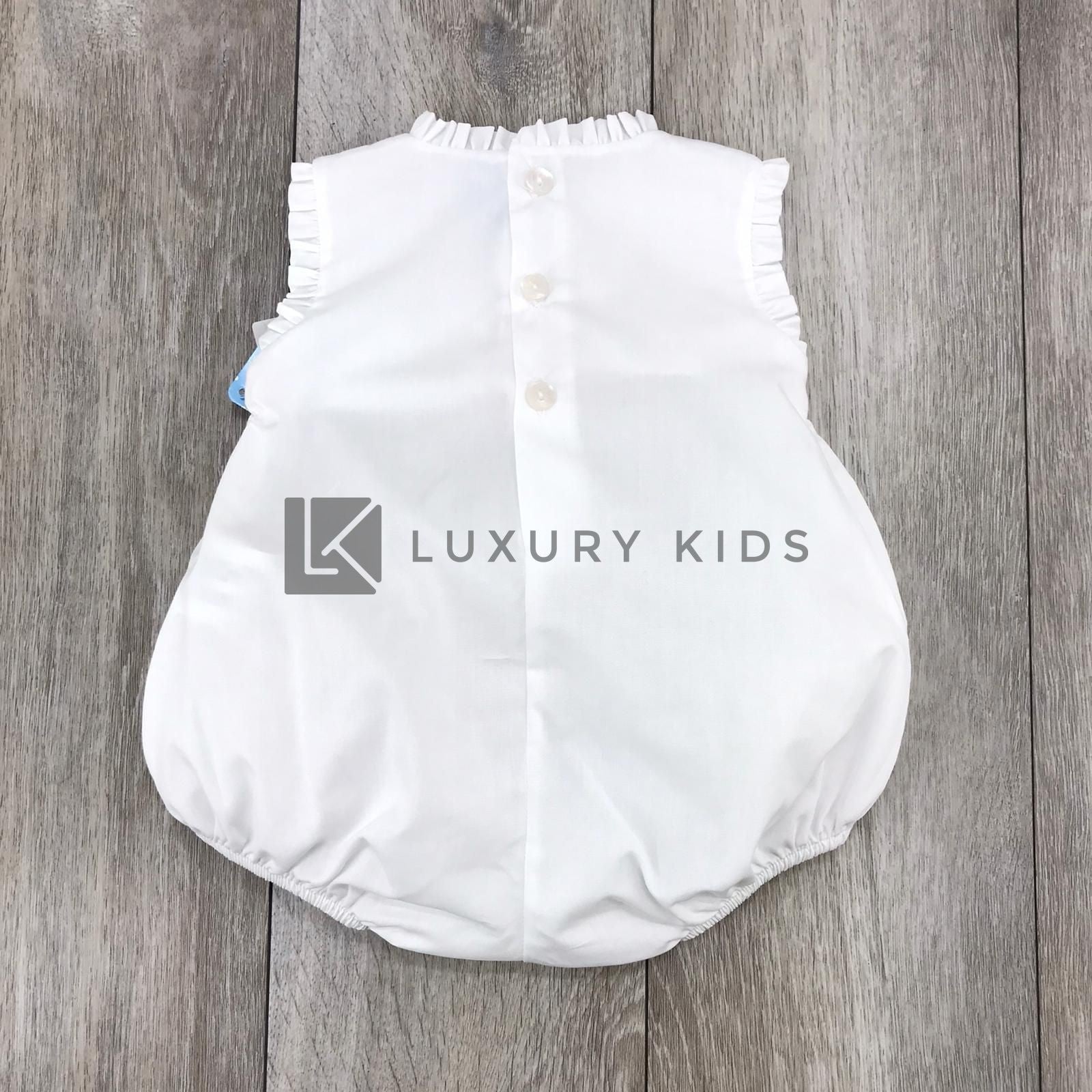 Weißer ärmelloser Strampler aus Baumwolle mit Smok auf der Brust.