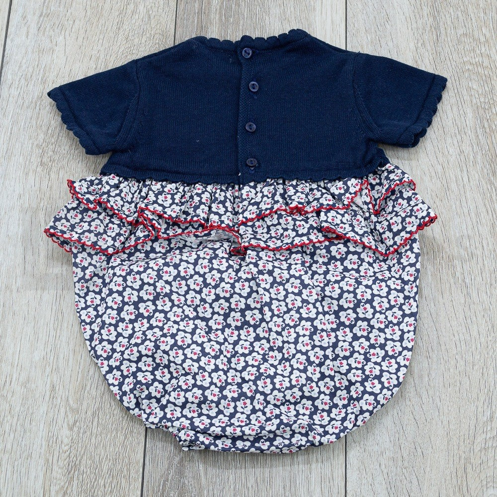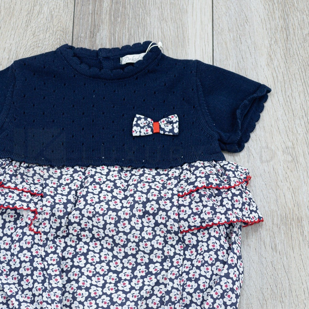 Einteiliger Strampler aus Baumwolle mit halben Ärmeln, Oberteil aus blauem Garn und Unterteil aus Blumenstoff.