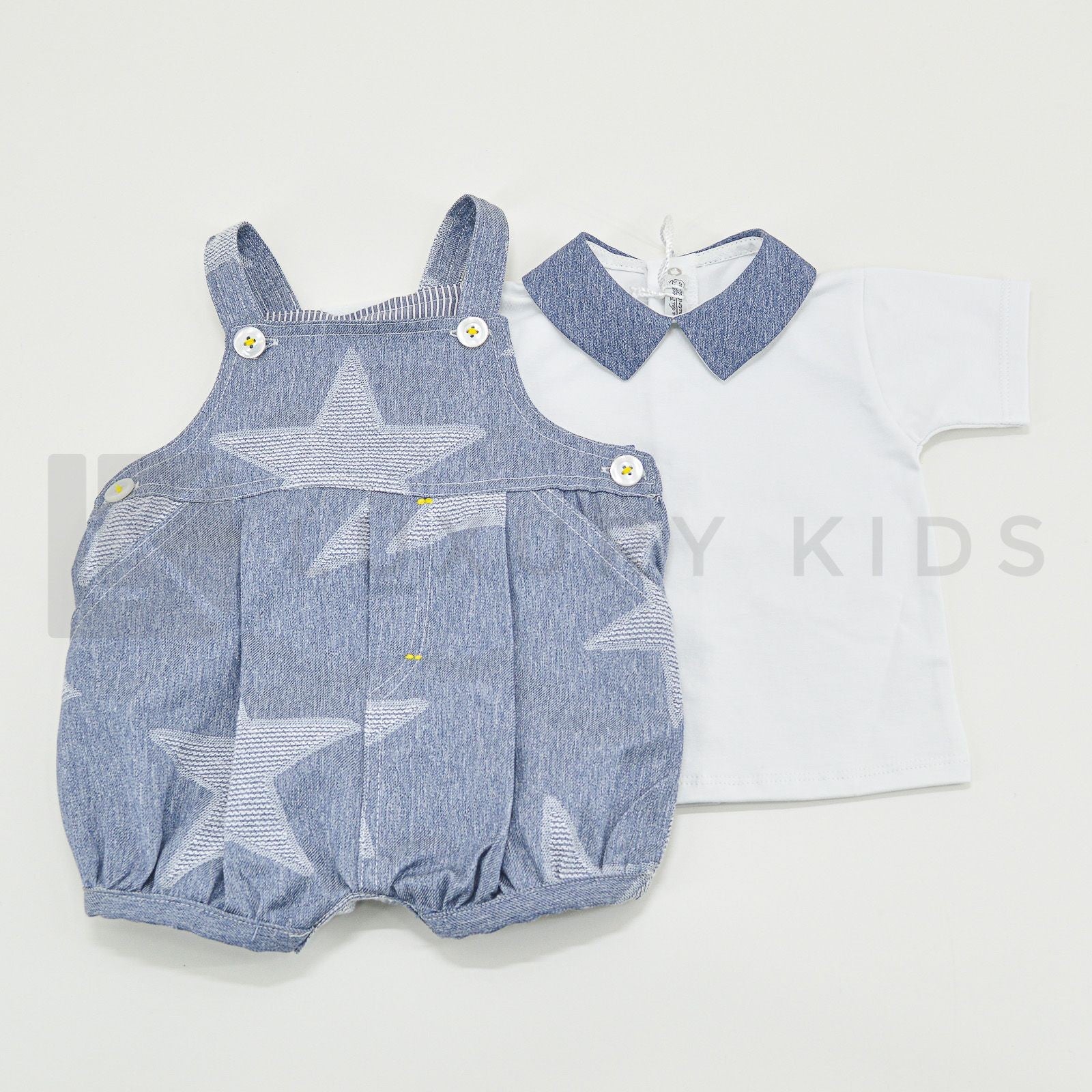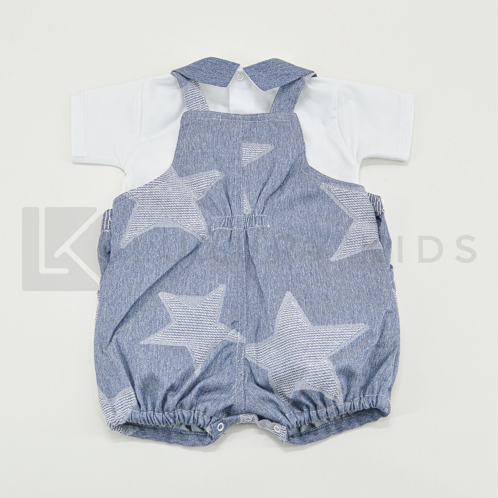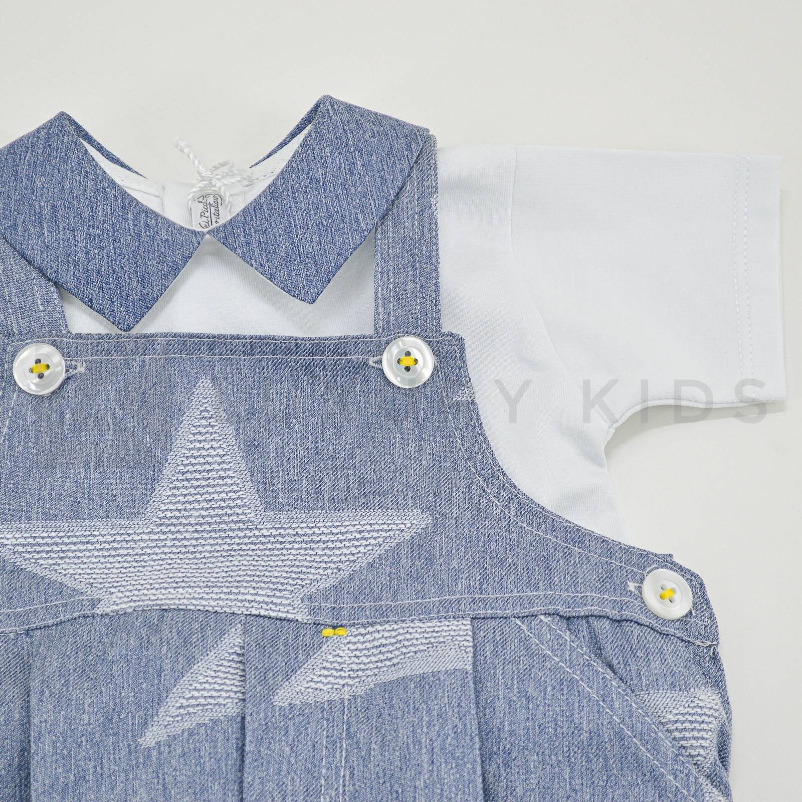 Einteiliger Strampler mit weißem T-Shirt und Jeansoverall.