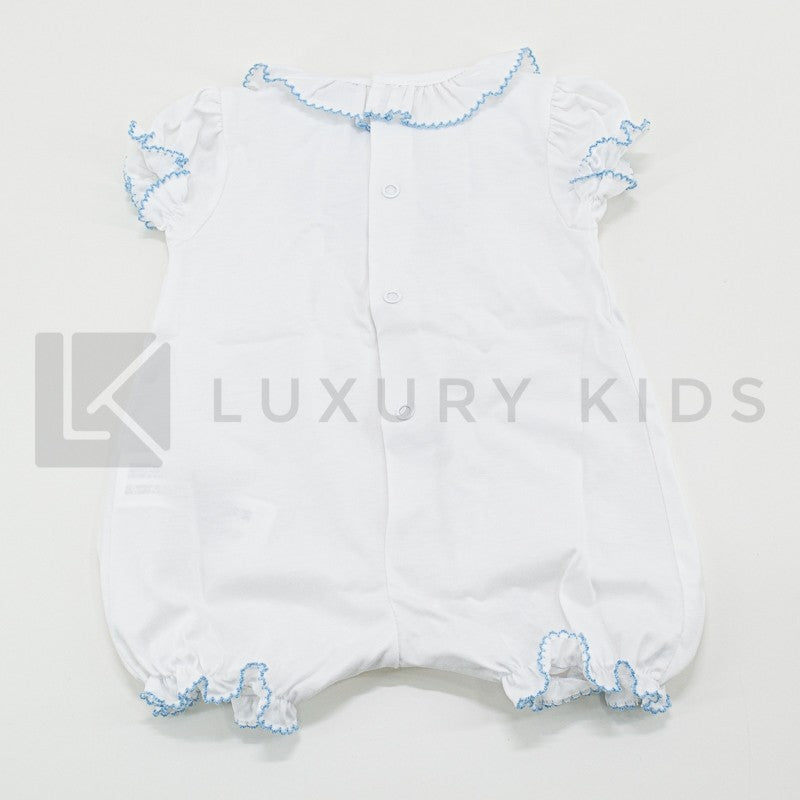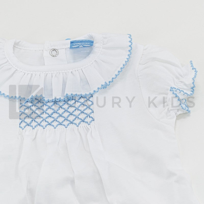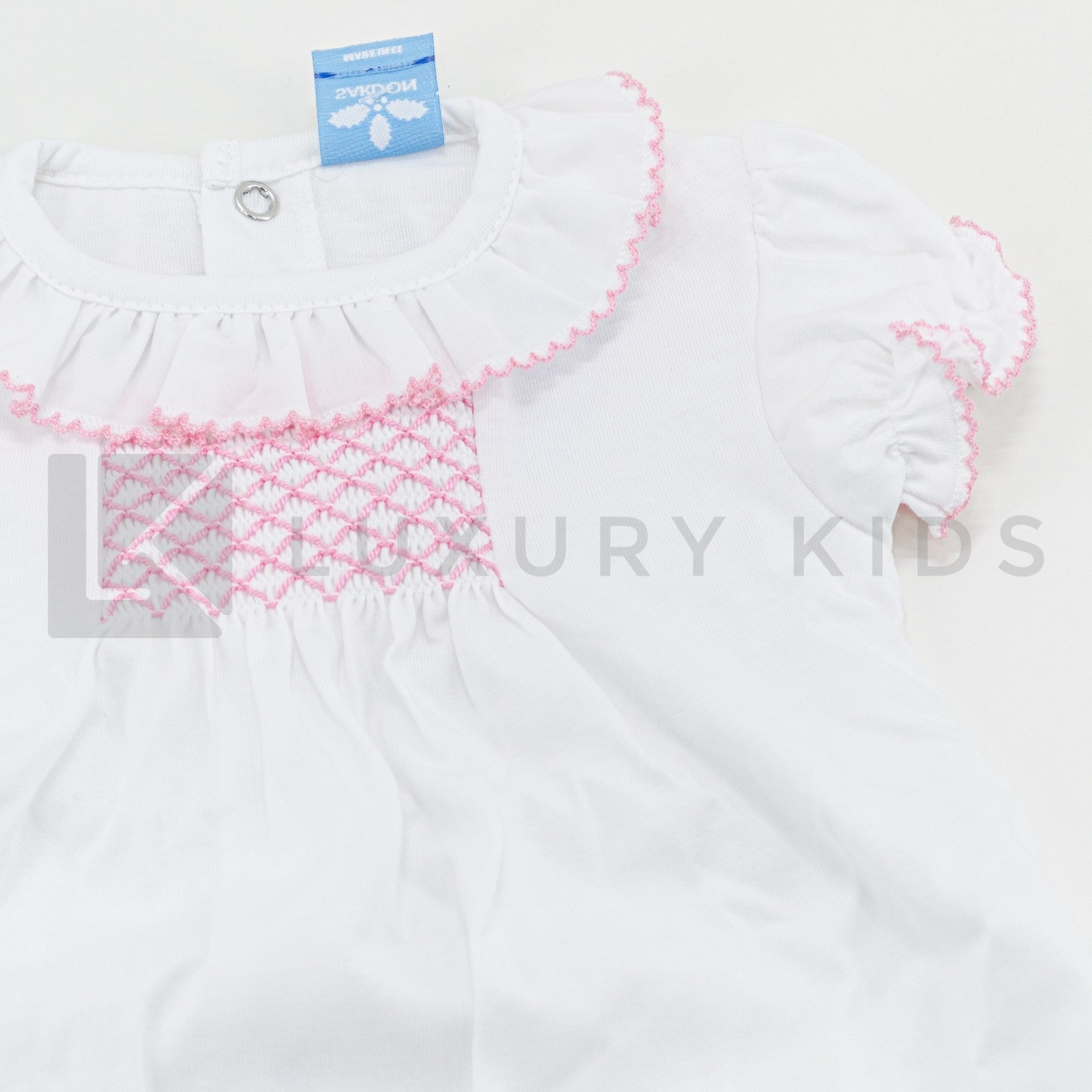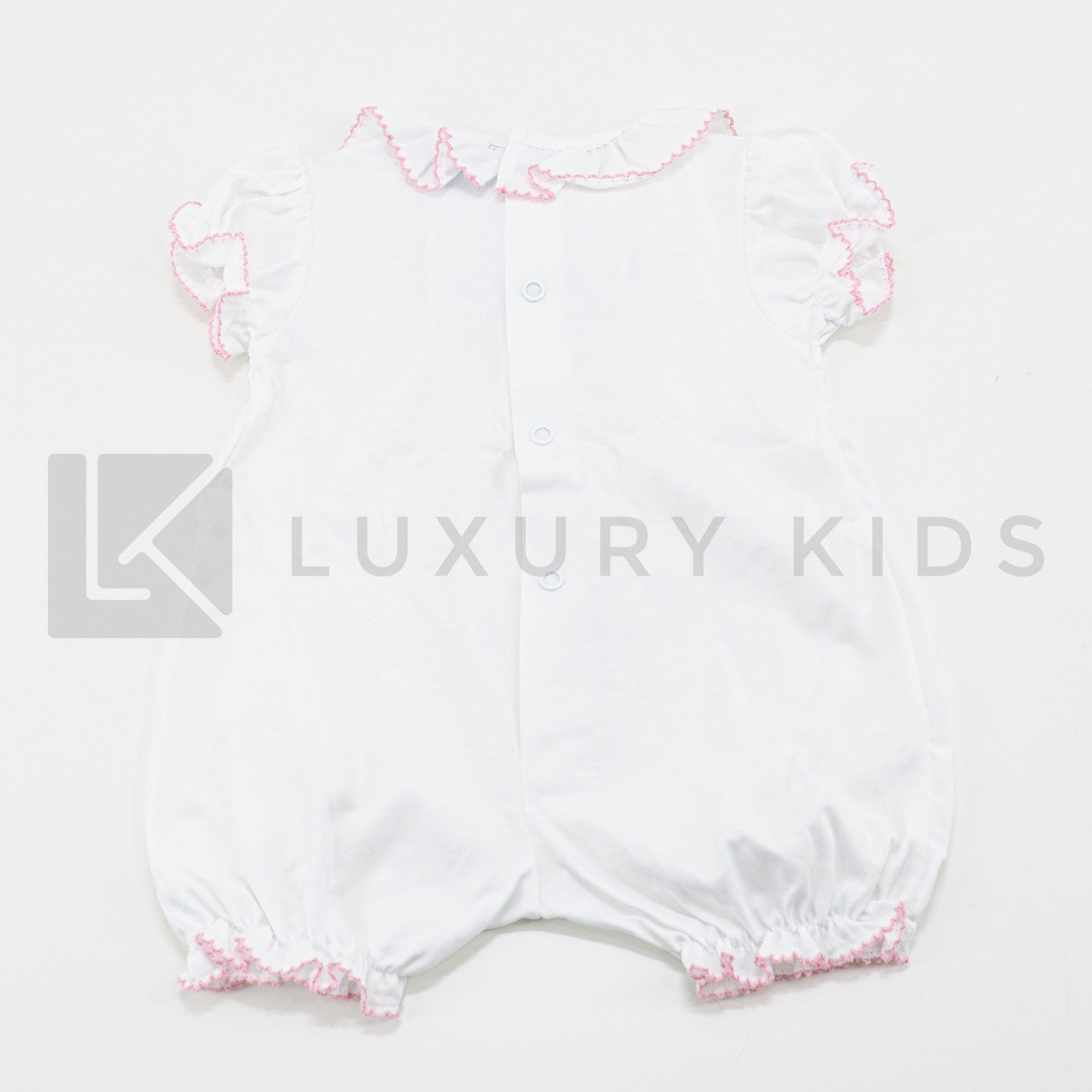 Weißer Baumwoll-Strampler mit Smok auf der Brust
