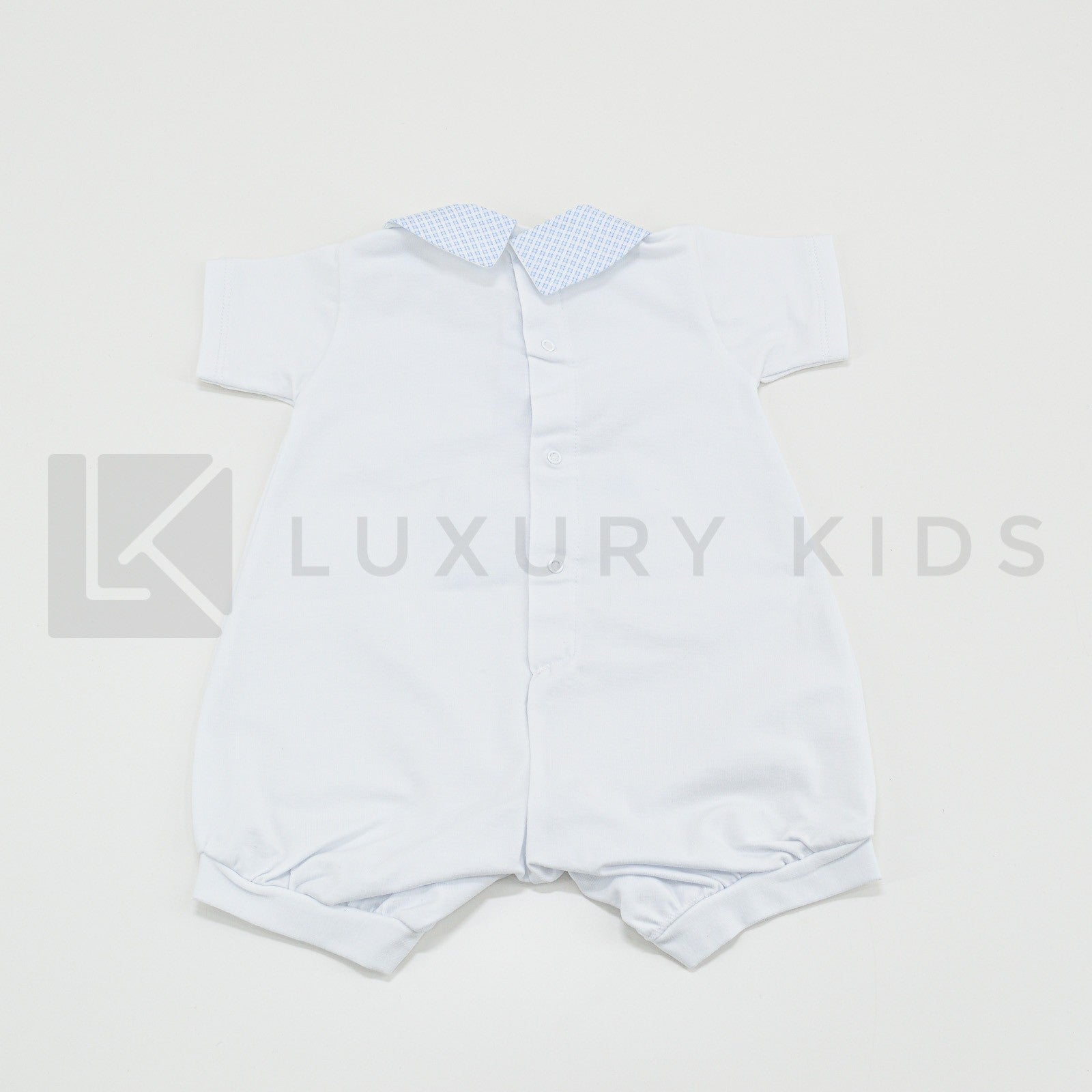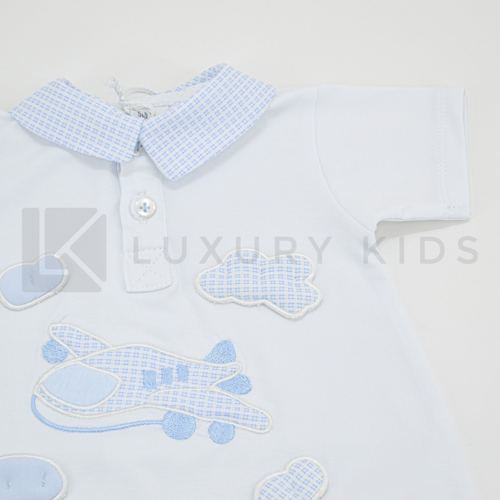 Babyblauer und weißer ganzer Strampler mit Flugzeugen.