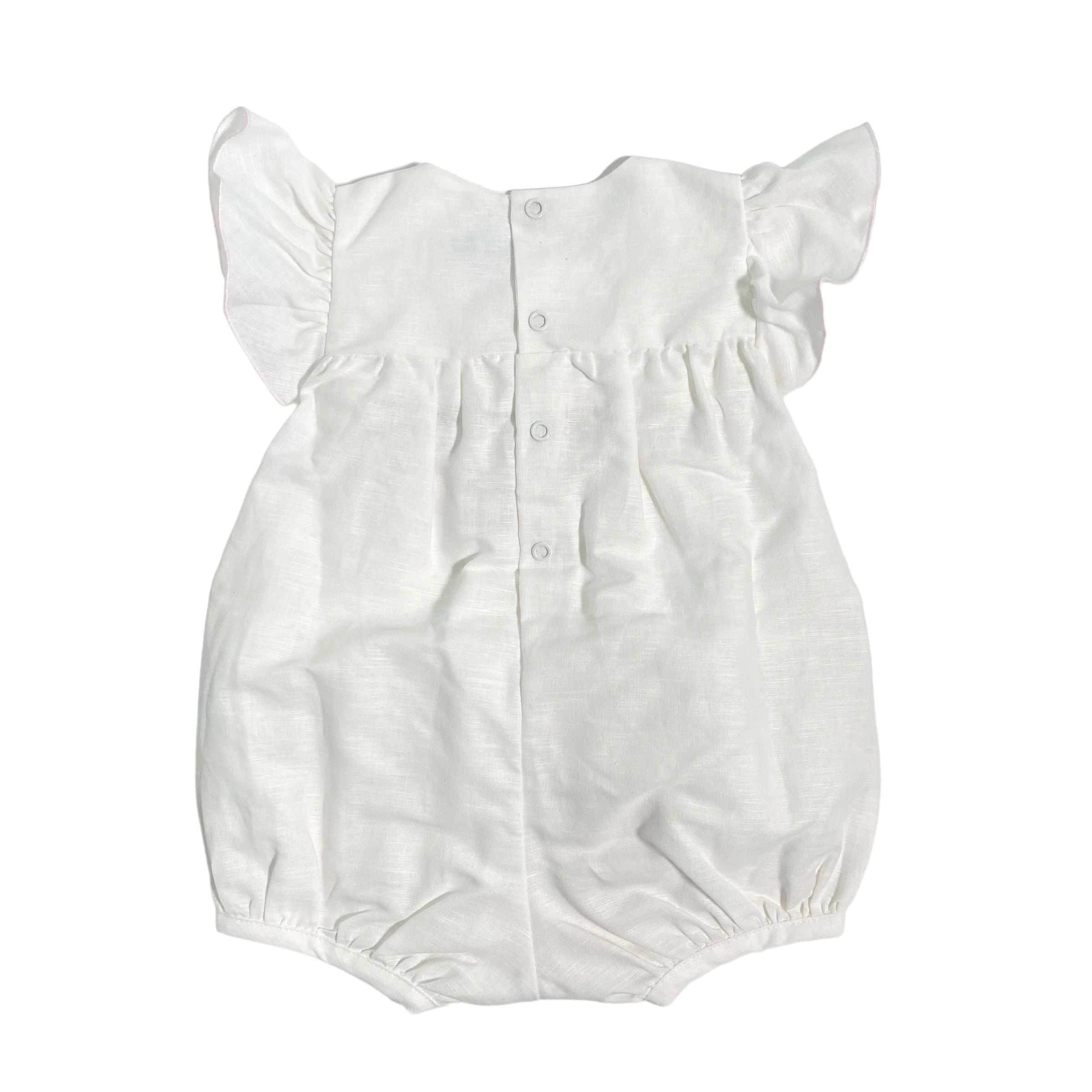 Einteiliger Strampler aus cremefarbener Leinenmischung, handbestickt mit puderrosa Blumen.