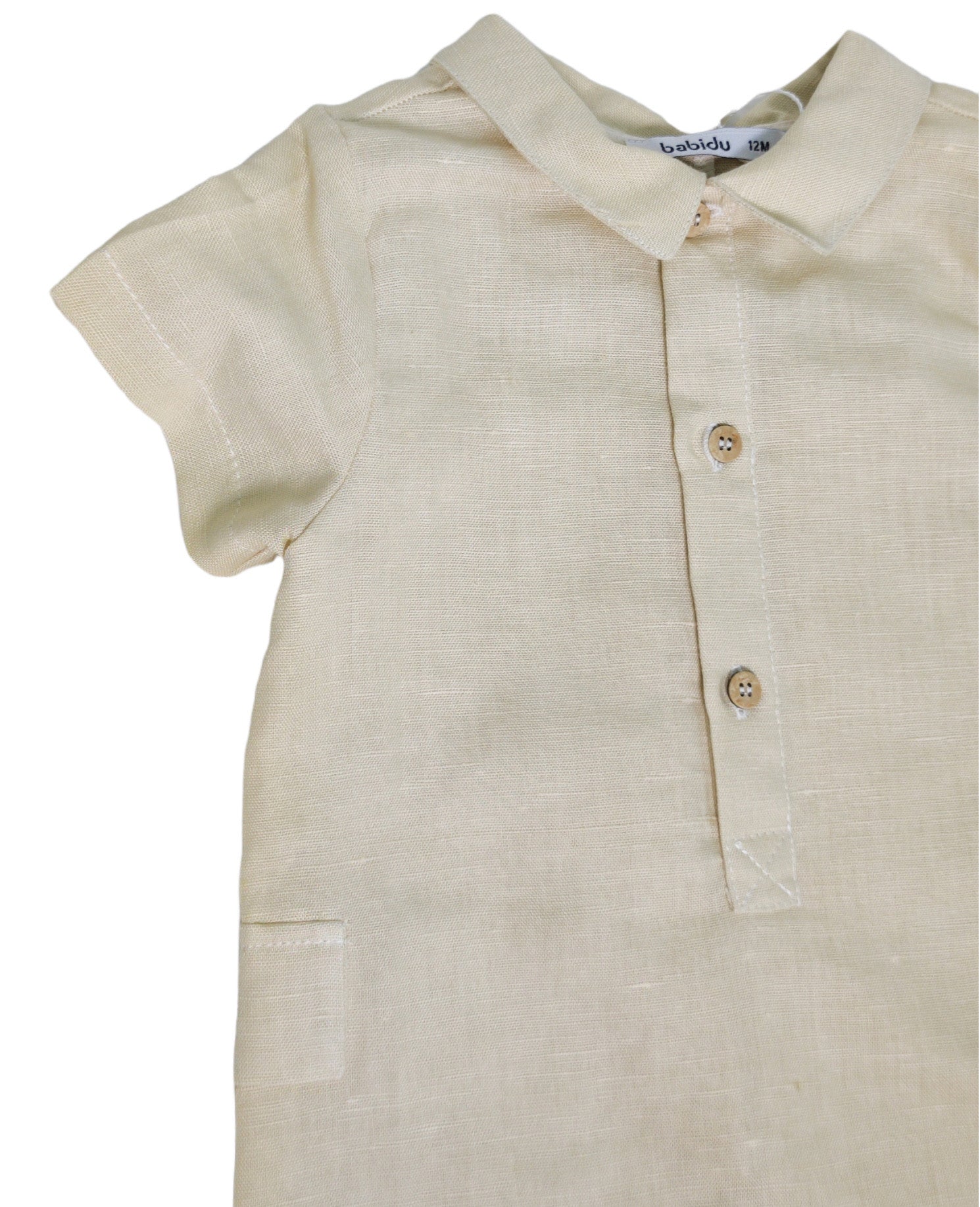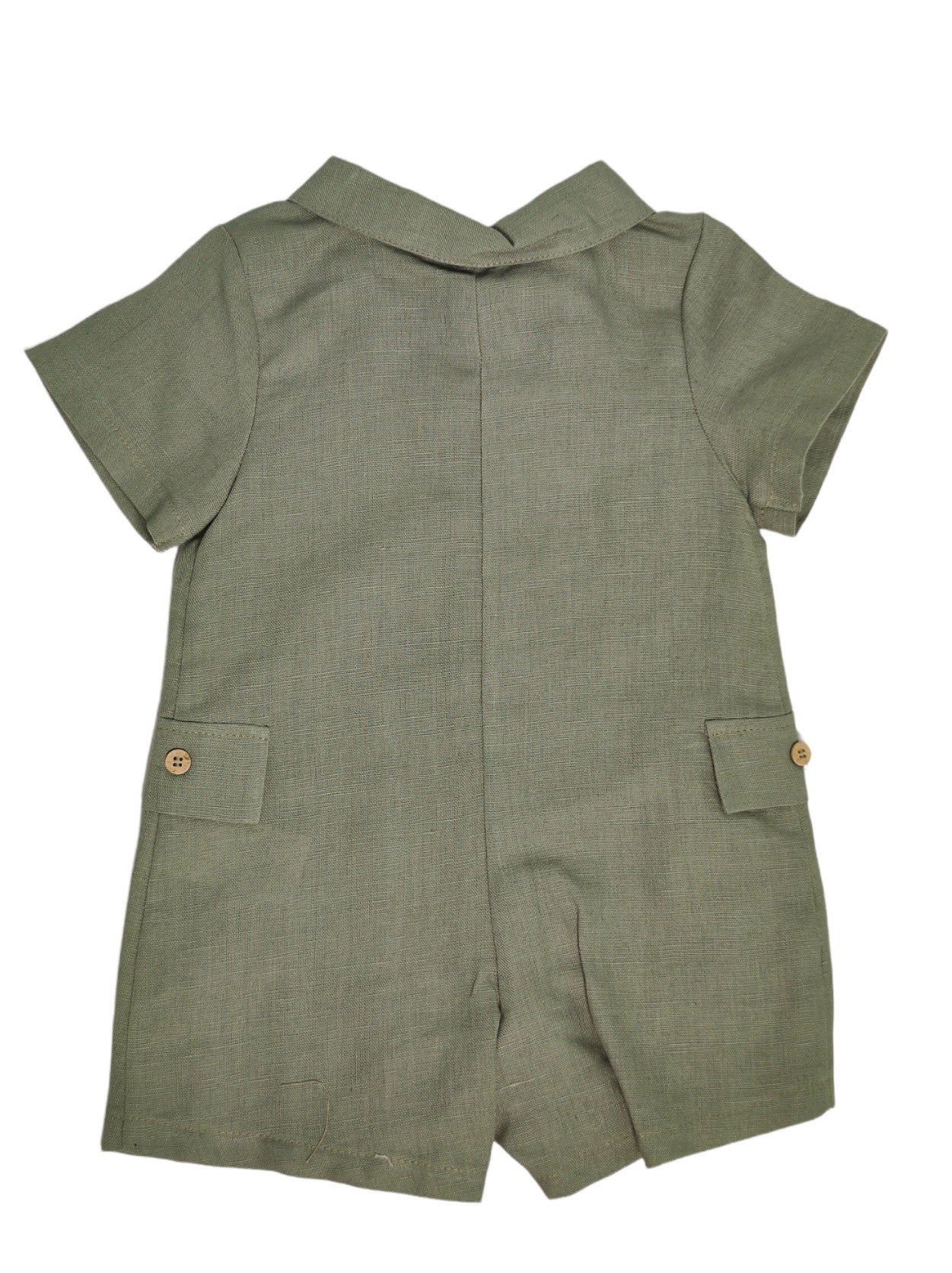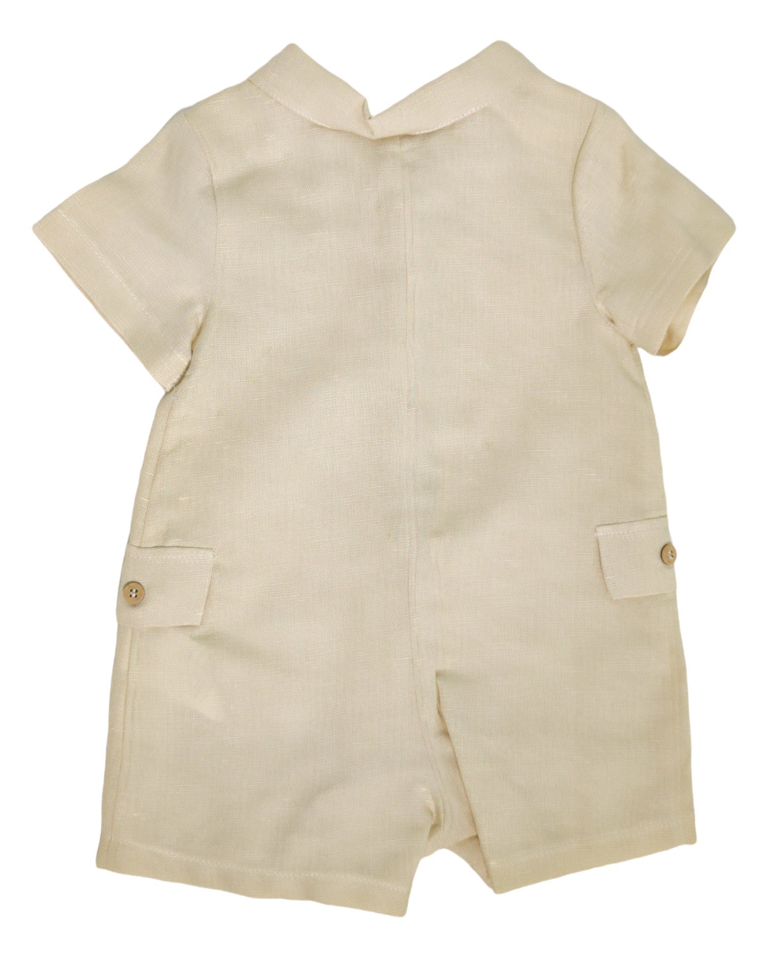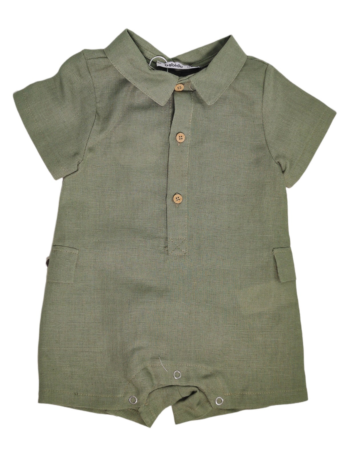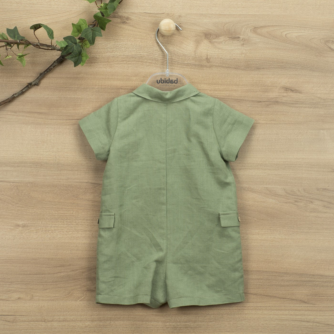 Strampler mit halben Ärmeln aus beigem und grünem Leinen.