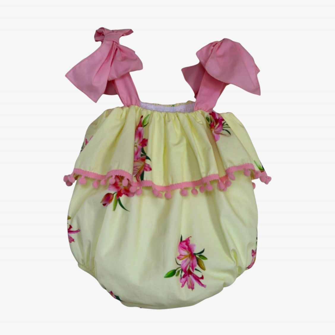 motivo a giglio giallo chiaro. Fresca e comoda, ha una balza con pompon rosa e graziosi