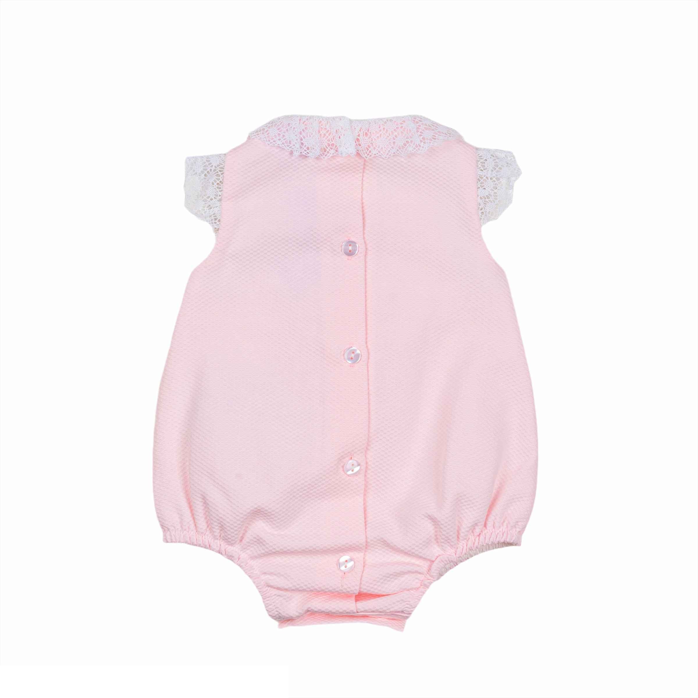 Strampler aus Wabenbaumwolle, Armlöcher, rosa Farbe, Rundhalsausschnitt mit Häkelspitze und am Rand der Schultern