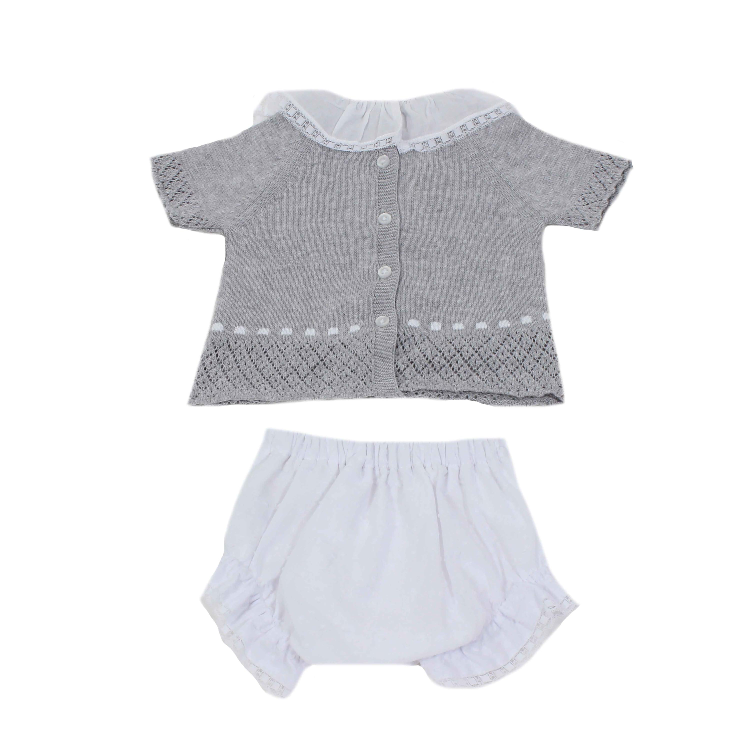 Komplett aus Baumwollgarn, bestehend aus grauem Pullover mit halben Ärmeln, Rouche und Spitze am Hals. Perforation an den Rändern. Rückenverschluss mit Knöpfen.