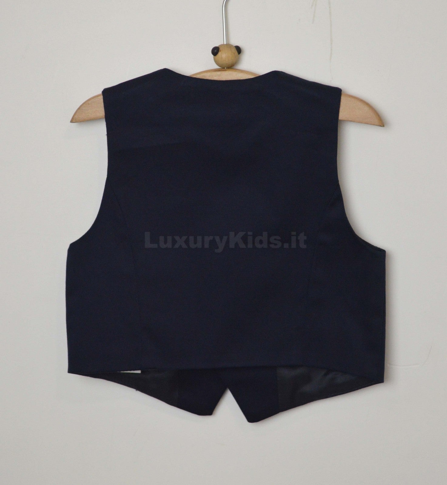 Weste aus blauer Baumwolle mit Taschen aus gepunktetem Stoff und Verschluss mit drei Knöpfen auf der Vorderseite.