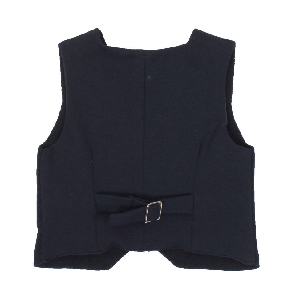 Weste aus gemischter Wolle. Mit Knöpfen auf der Vorderseite. Auf der Rückseite innen mit Satin gefüttert. Gefälschte Taschen auf der Vorderseite. Elegant und schick.