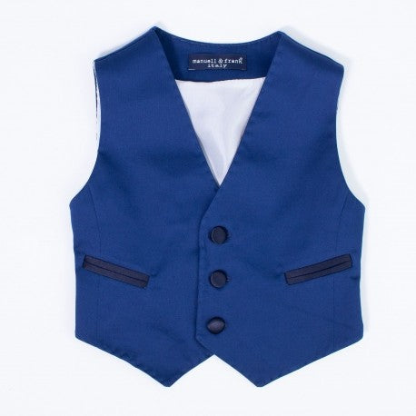 Weste aus hellblauer Baumwolle mit Drei-Knopf-Verschluss aus nachtblauem Satin.