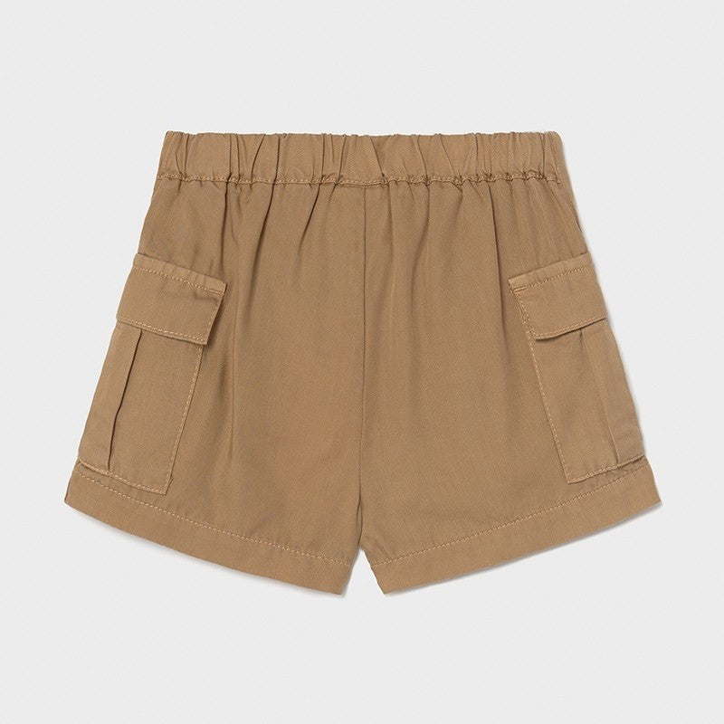Beige Baumwollshorts mit Seitentaschen. Feste Taillenschleife und verstellbarer Gummizug.
