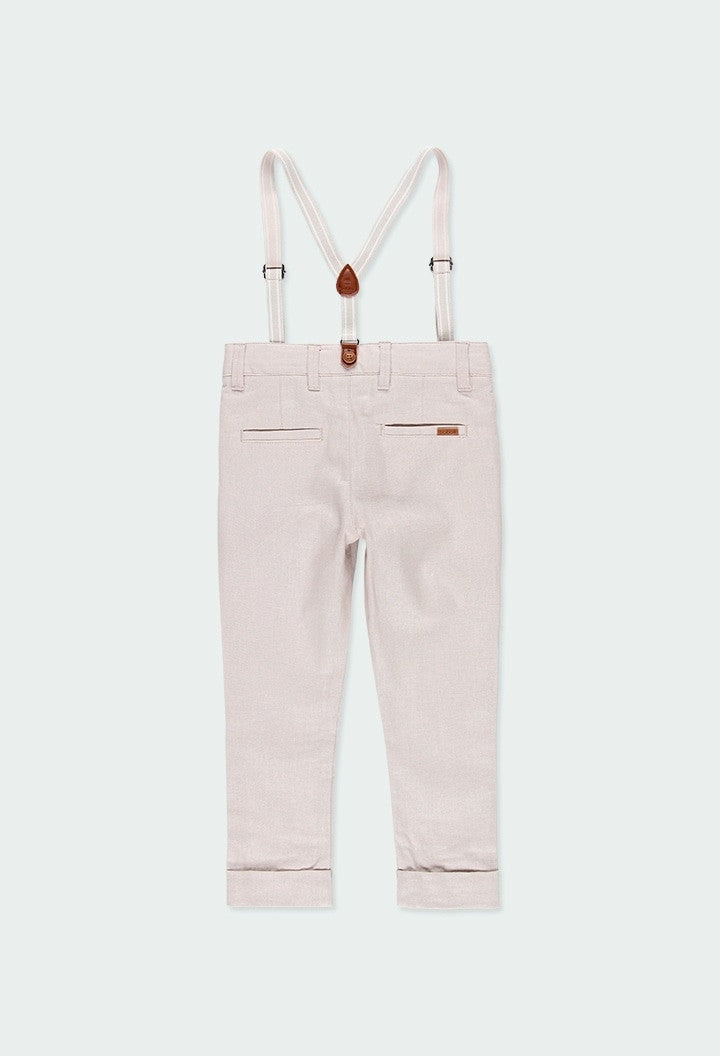 Leinenhose für Jungen mit beigen verstellbaren Trägern.