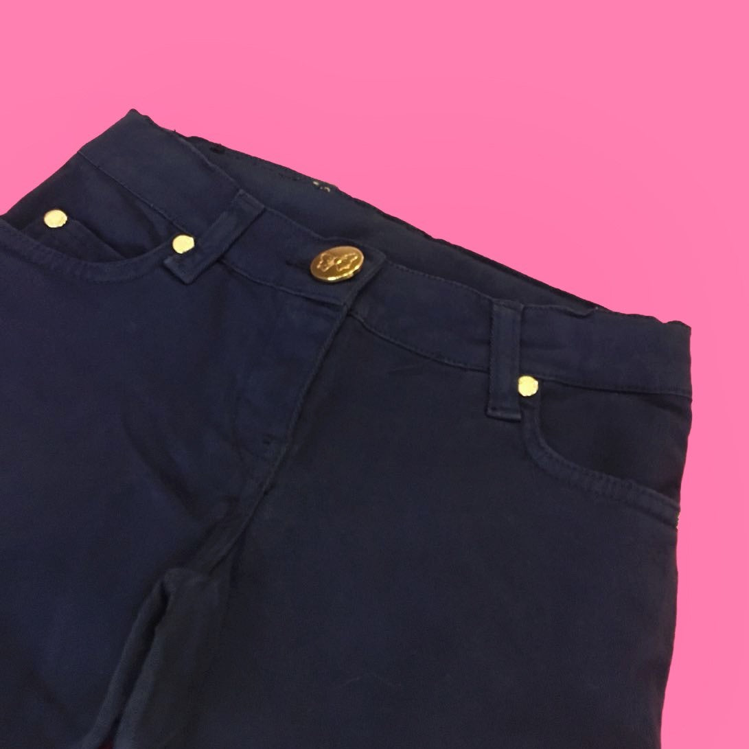 Einfarbige, warmblaue Baumwollhose, schlankes Modell und Knopf- und Reißverschluss