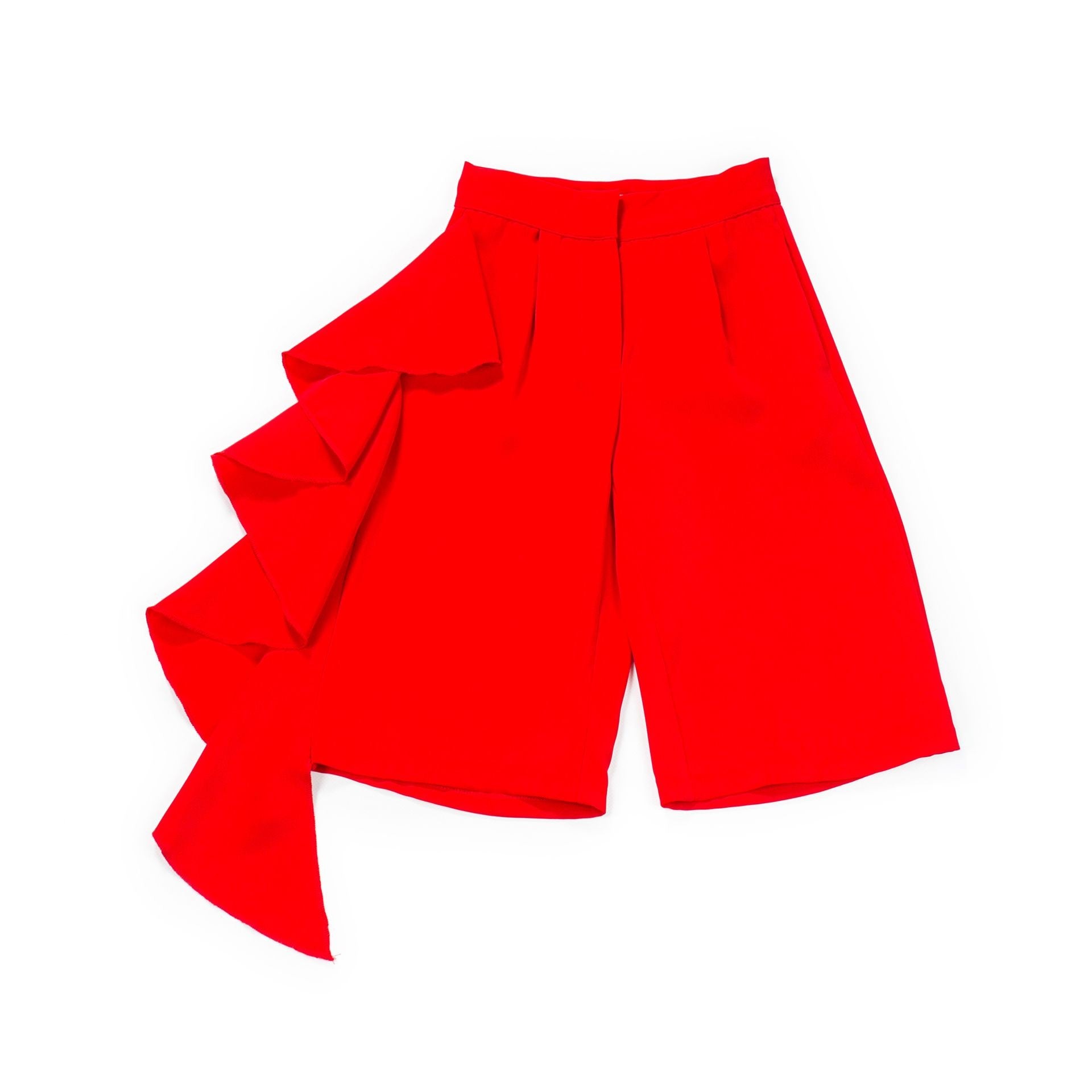 Einfarbige rote Cropped-Hose mit Rüschen auf der rechten Beinseite