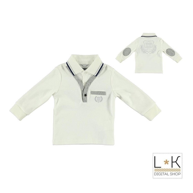 Einfarbiges Poloshirt aus warmweißer Baumwolle mit Cardigan-Imitat auf der Vorderseite und angedeuteter Brusttasche