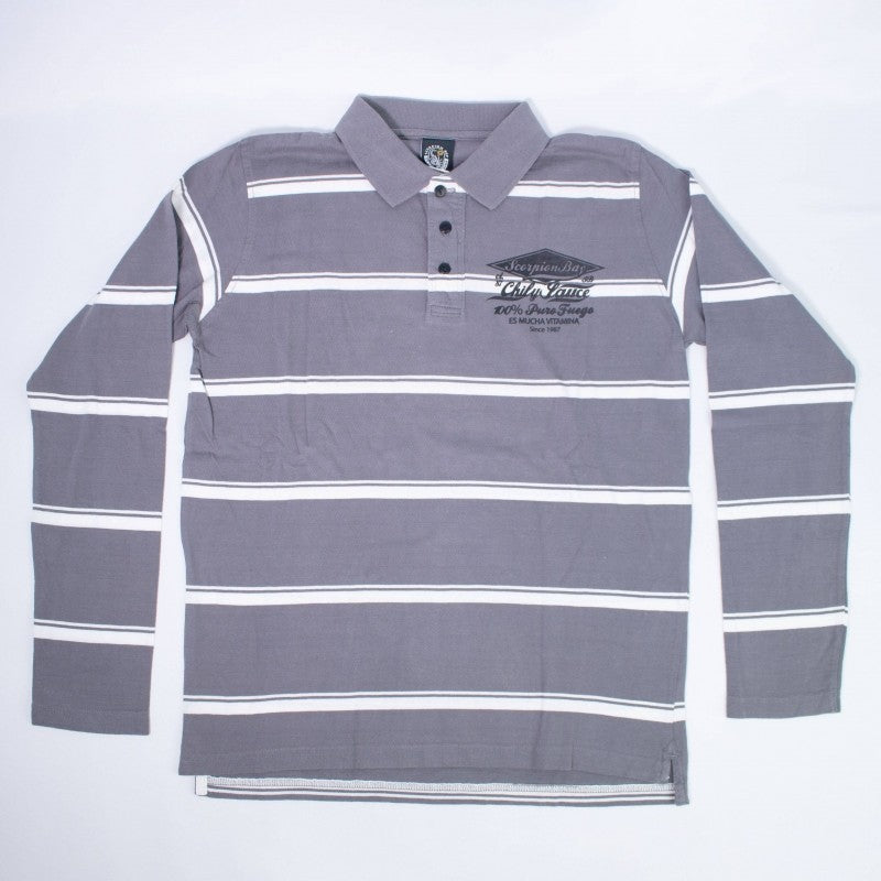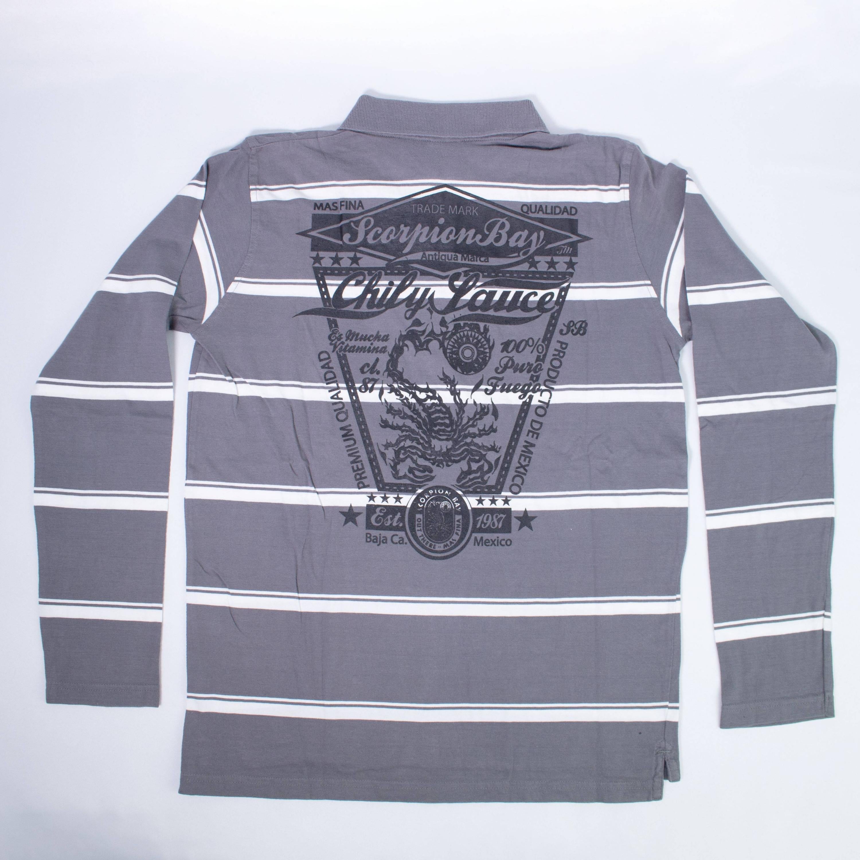 Poloshirt aus warmer grauer Baumwolle mit weißen Streifen mit Aufdruck auf der Brust und auf dem Rücken