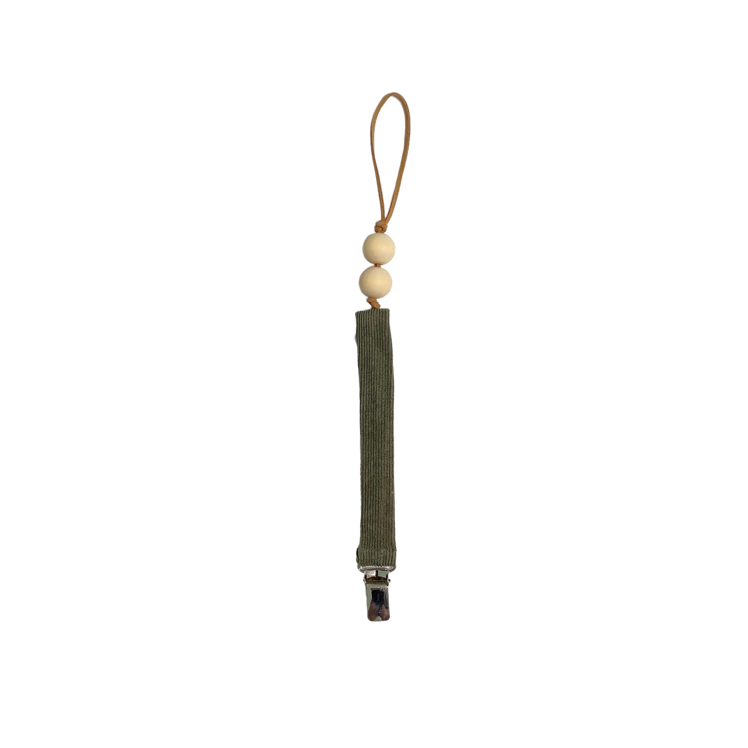 Schnullerhalter aus gestreiftem Samt, einfarbig grün, mit Holzkugeln.