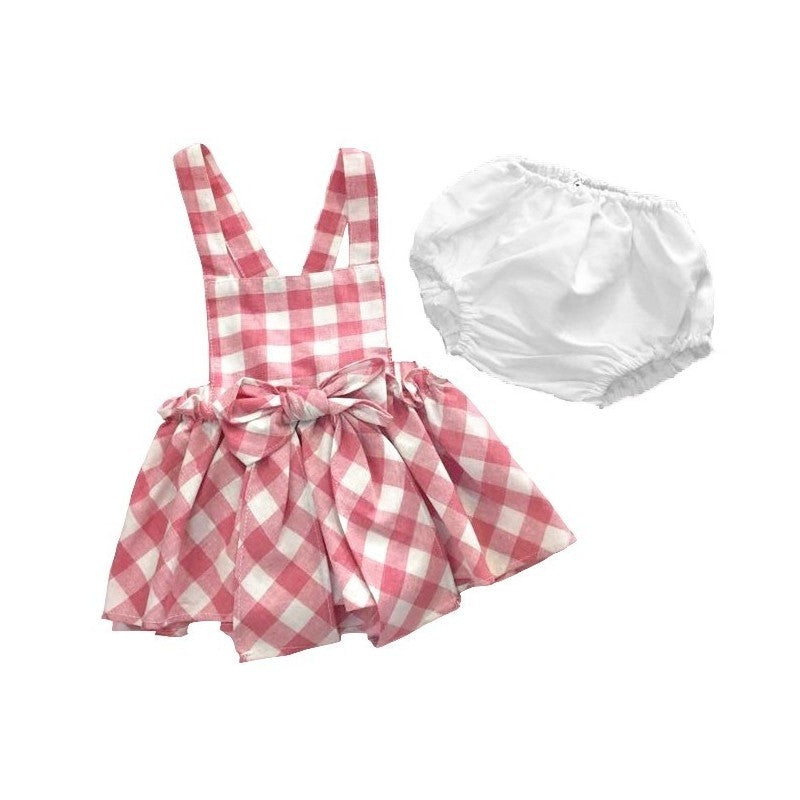 - Latzhose mit rosa und weiß kariertem Baumwollrock und Schleife auf der Rückseite