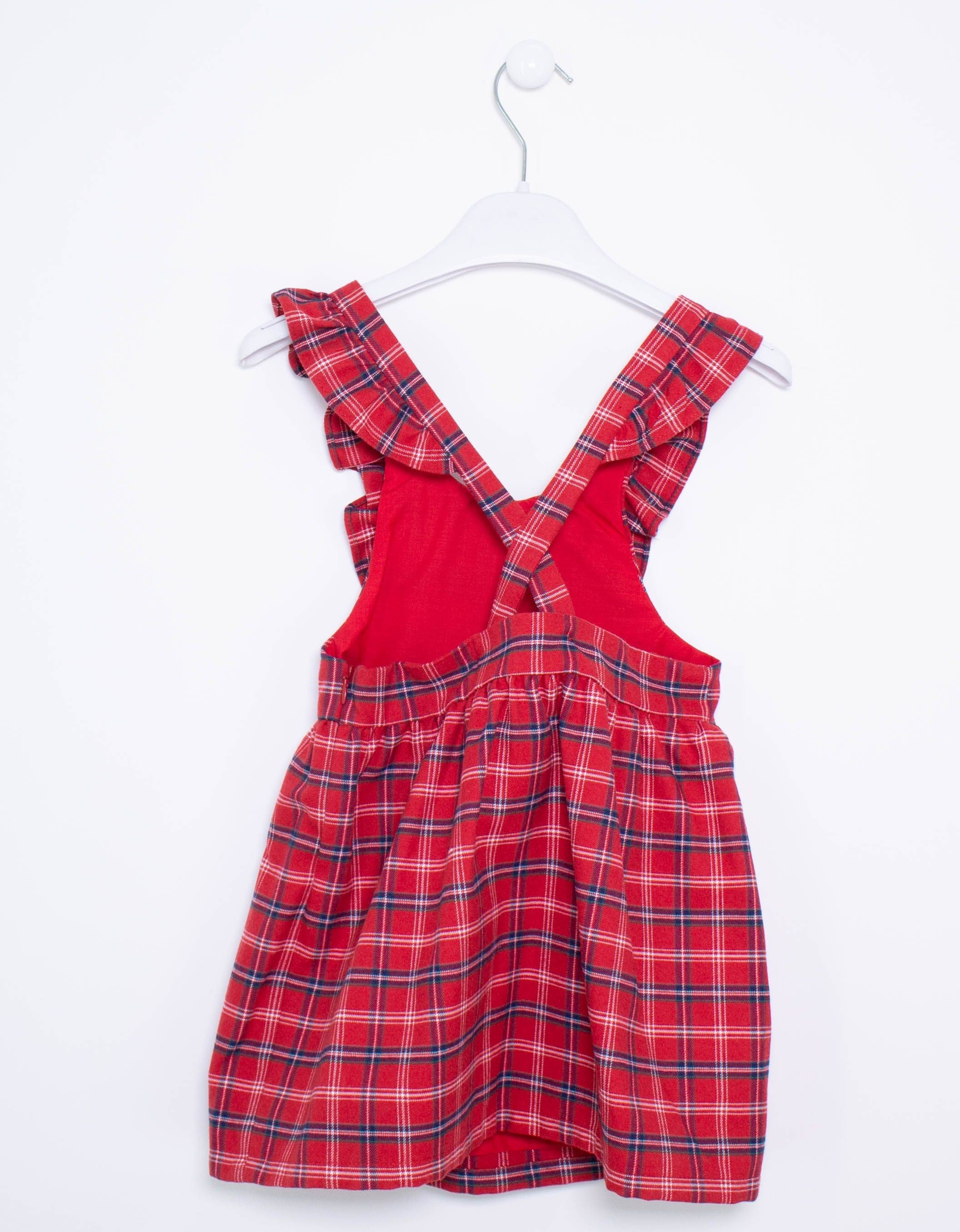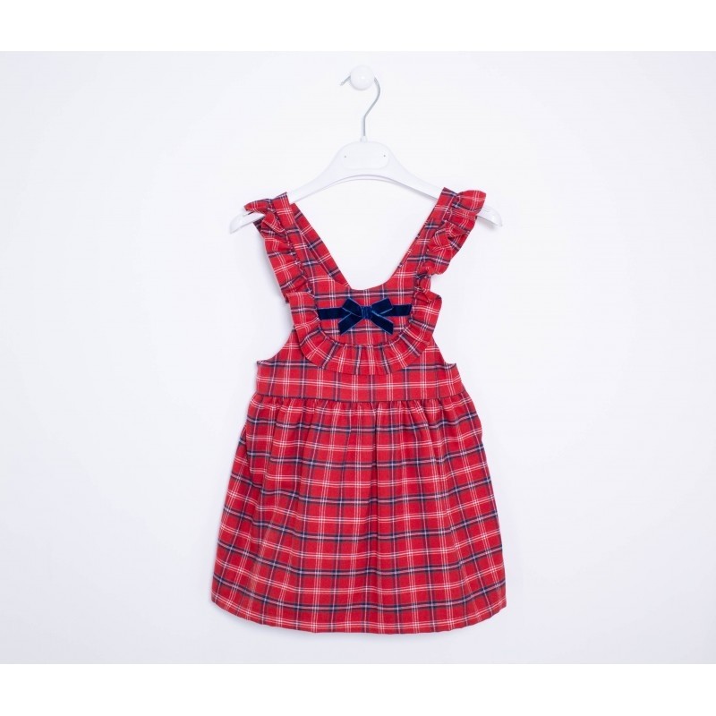 Rot karierte Latzhose mit blauer Samtschleife auf der Vorderseite.