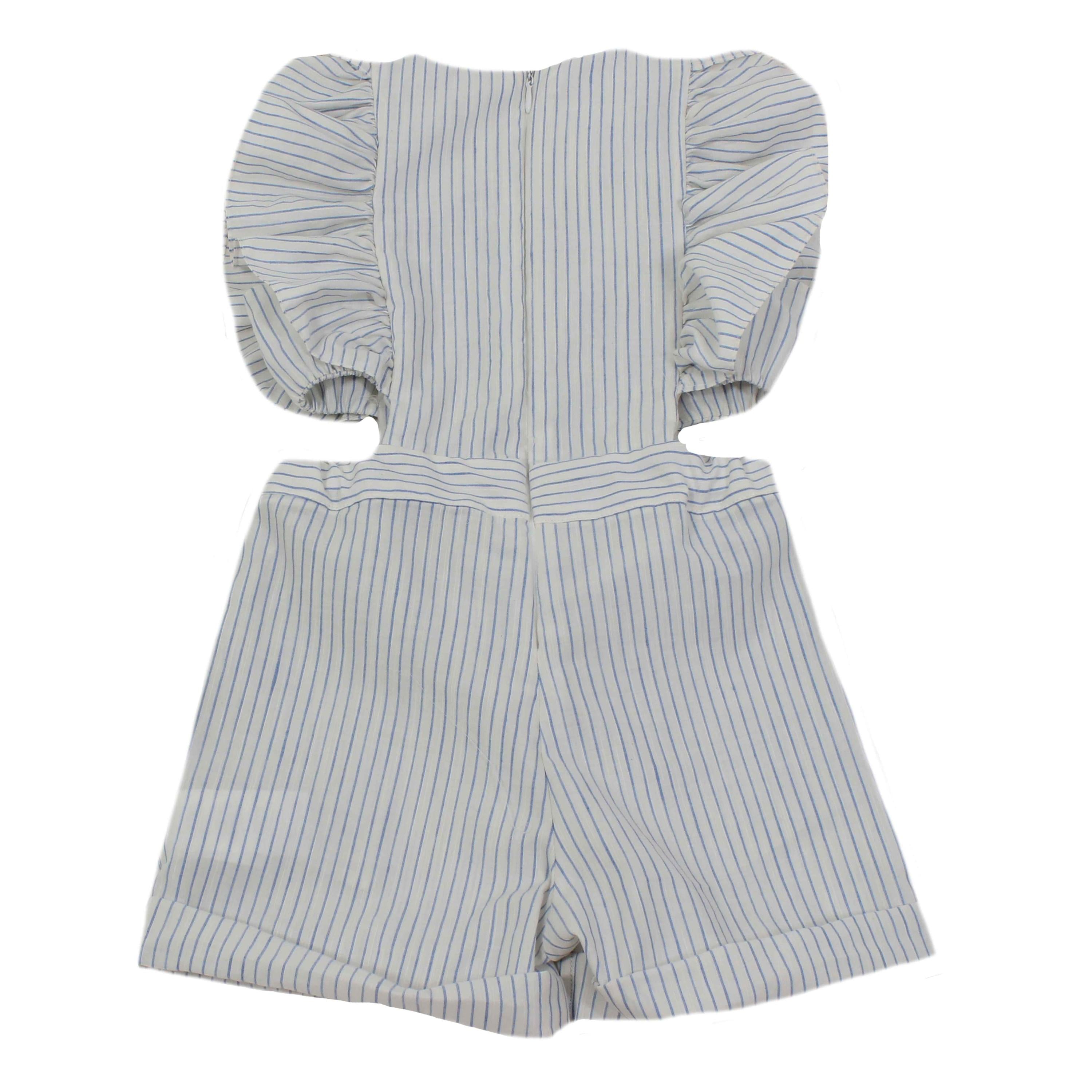 Latzhose aus cremefarbener Baumwolle mit hellblauen Streifen. Runder Ärmel mit Rouche. Bund mit Knoten und Shorts mit echten Taschen.
