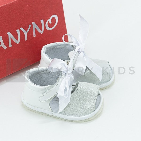 Sandale im Espadrille-Modell, aus glänzendem Echtleder und laminiertem Stoff, Riemen mit Aufreißverschluss, abnehmbare Satinschleife, an der Ferse geschlossen für besseren Halt, Innensohle aus echtem Leder, leichte Gummisohle, rutschfest.