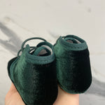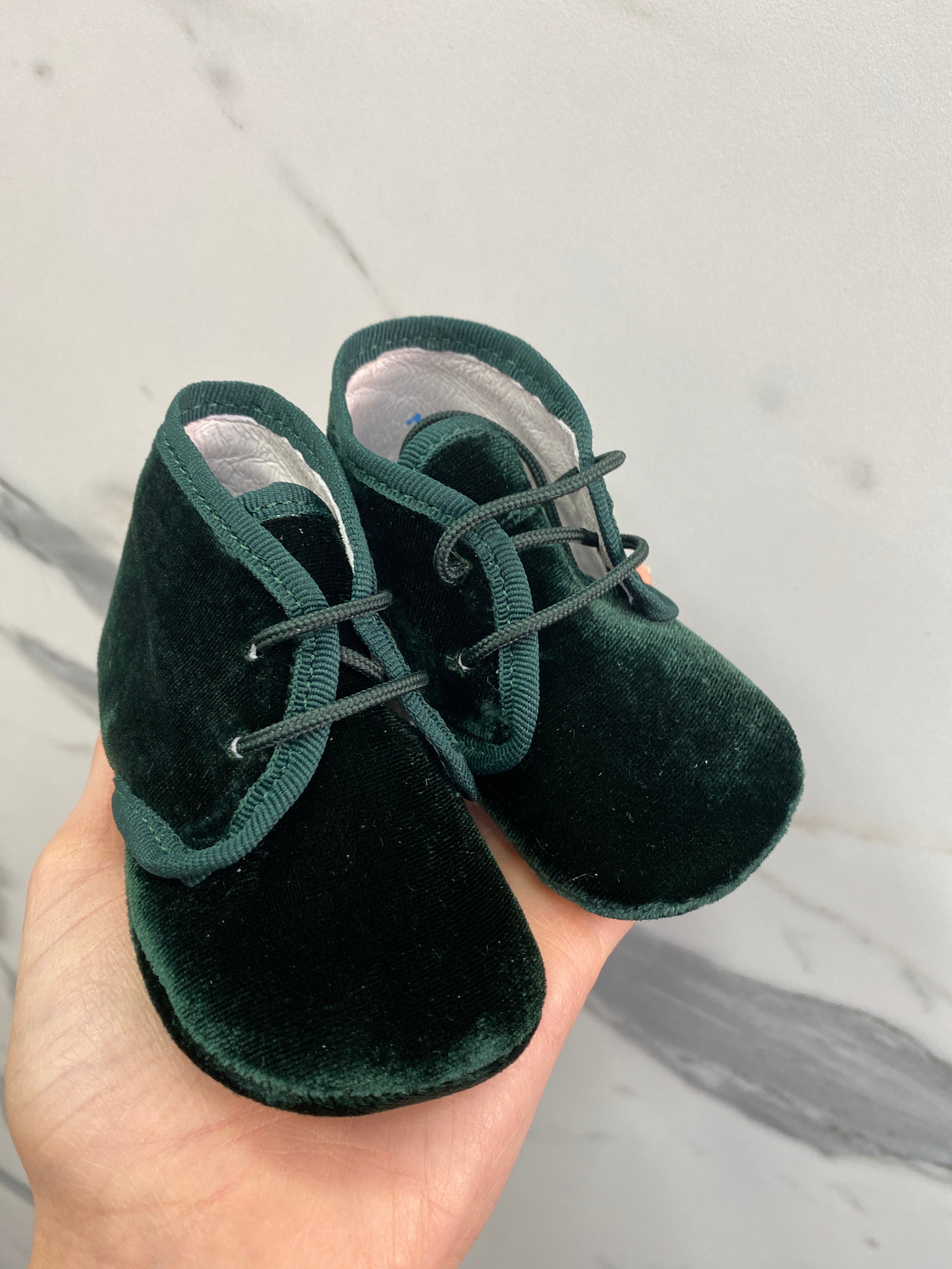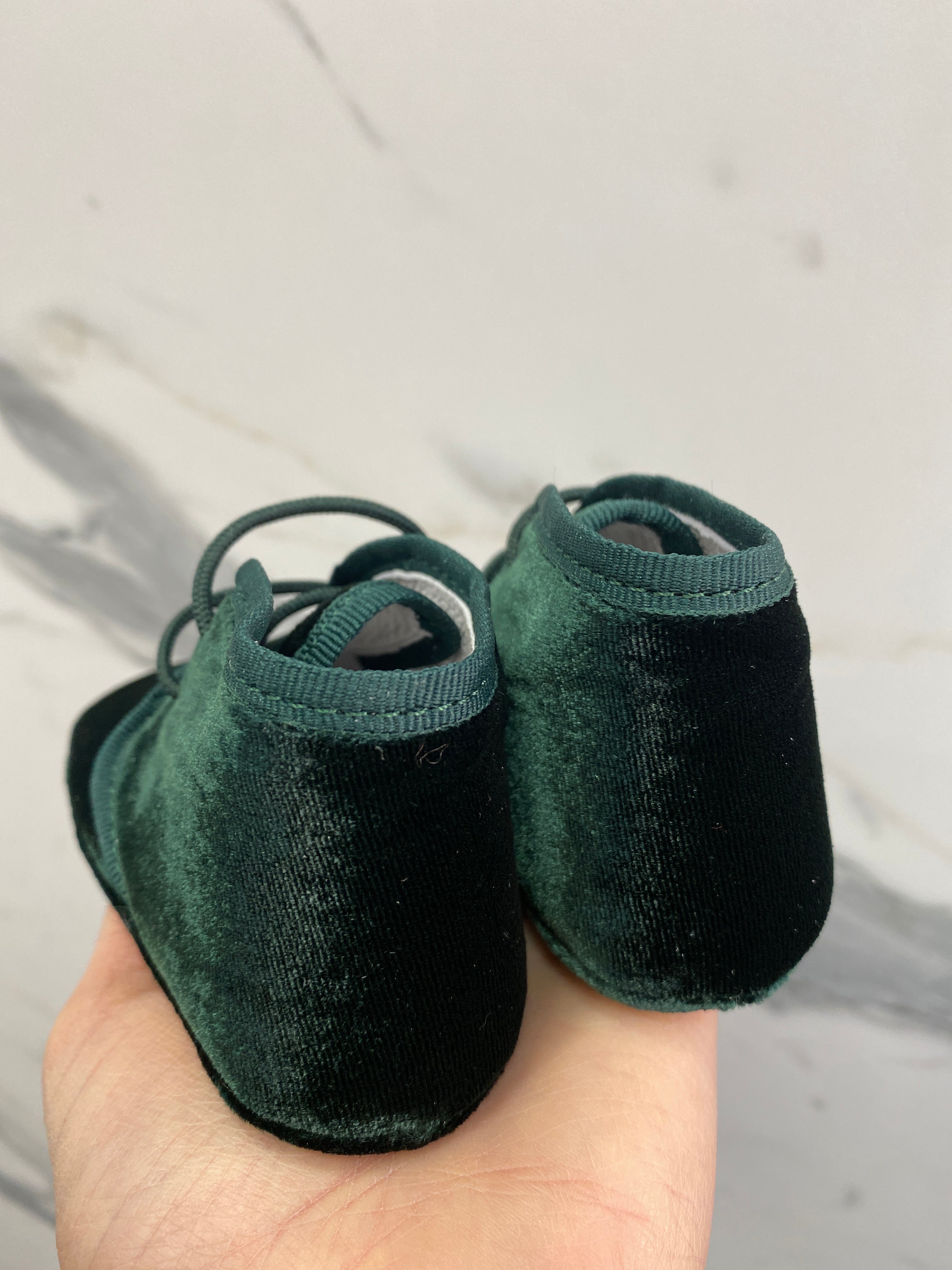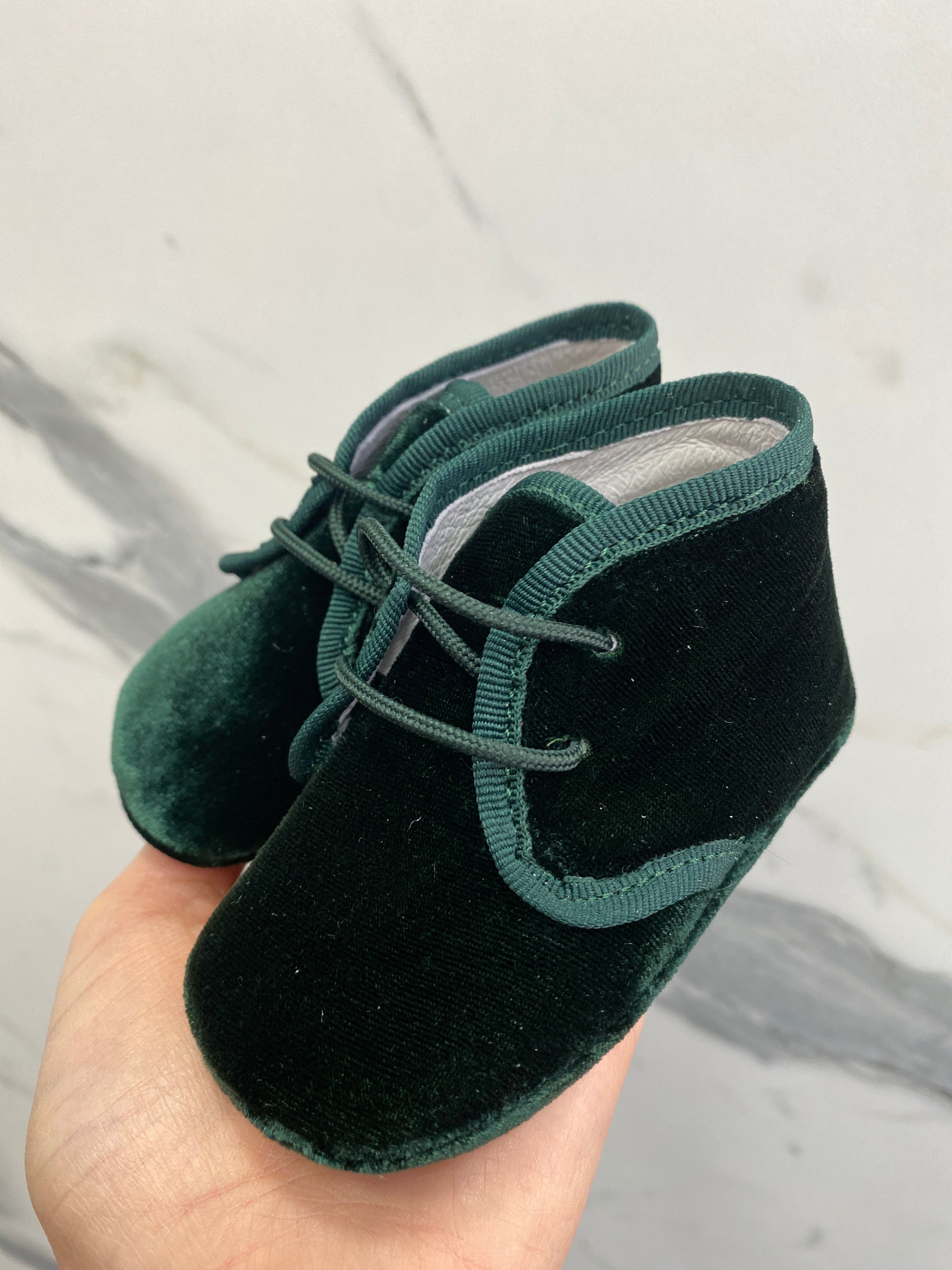 Krippenschuh mit neugeborenen Samtschnürsenkeln.