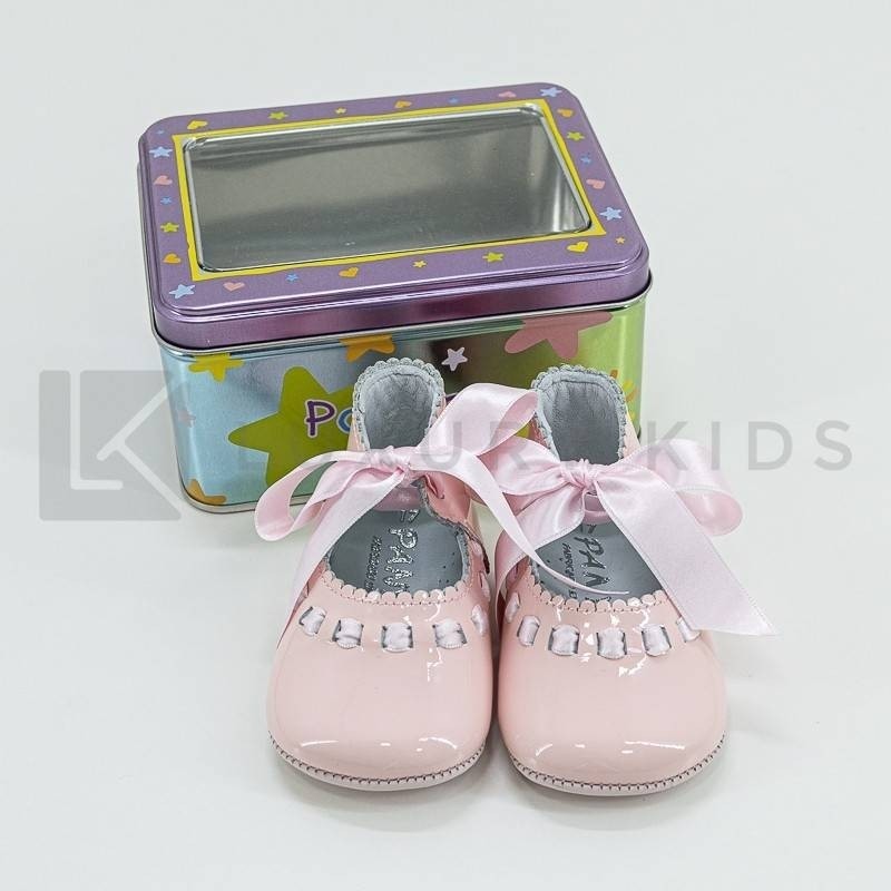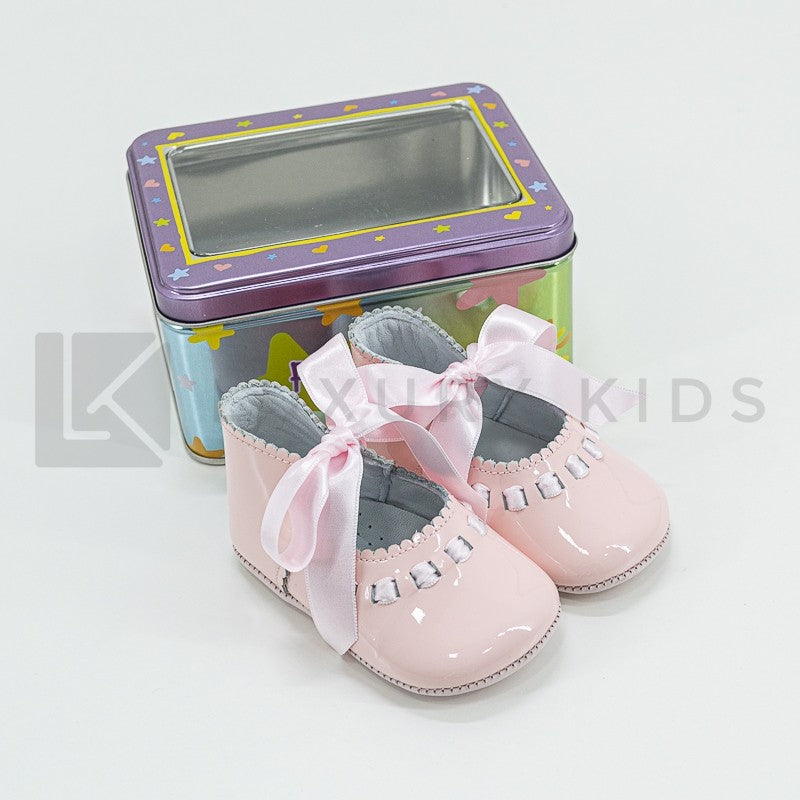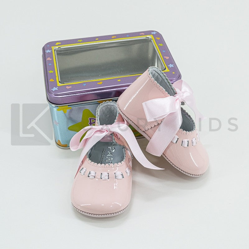 Wiegenschuh aus Lackleder mit Satinschleife vorne.