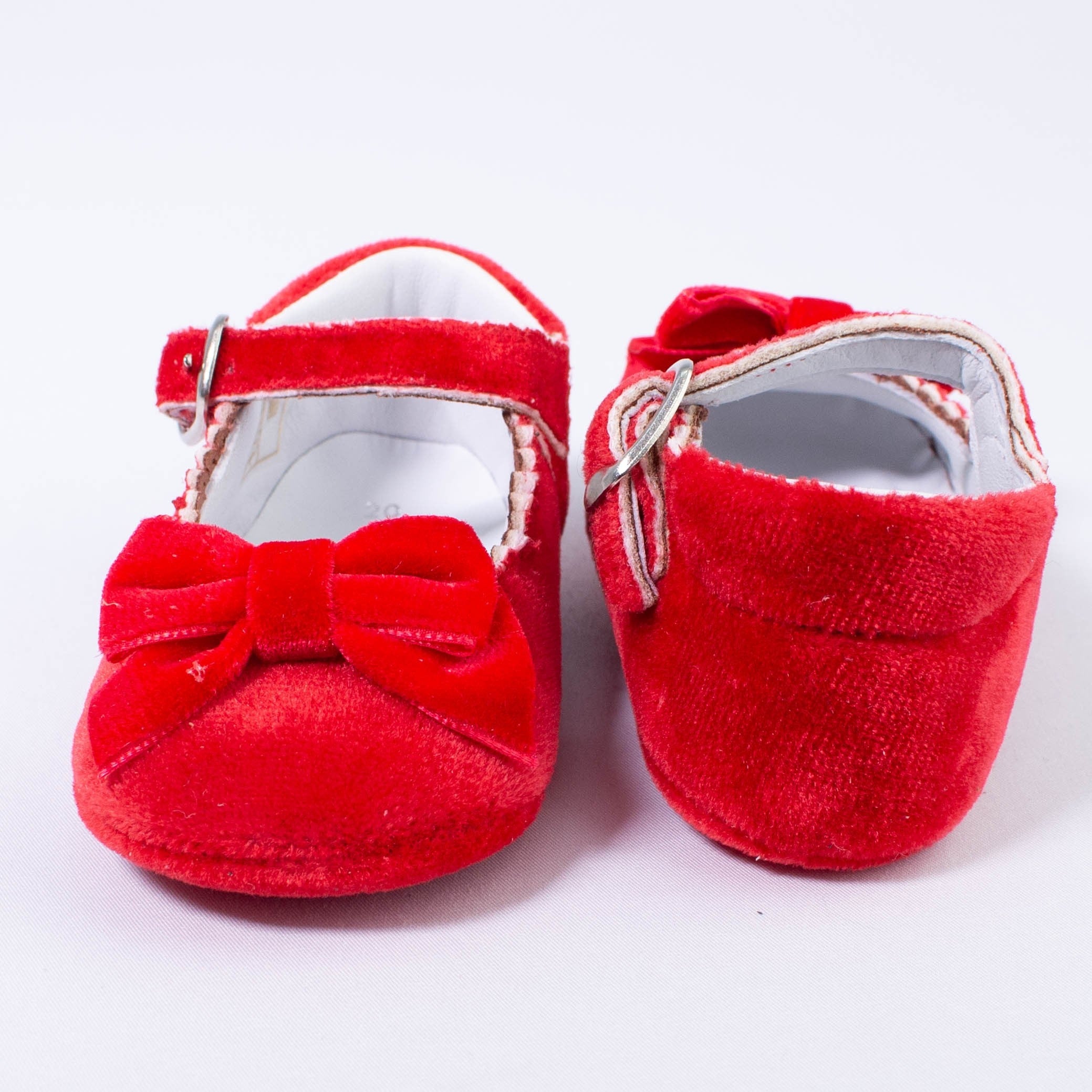 Sehr weiche Ballerina-Modellschuhe mit roter Samtschleife. Verschluss mit Riemen.