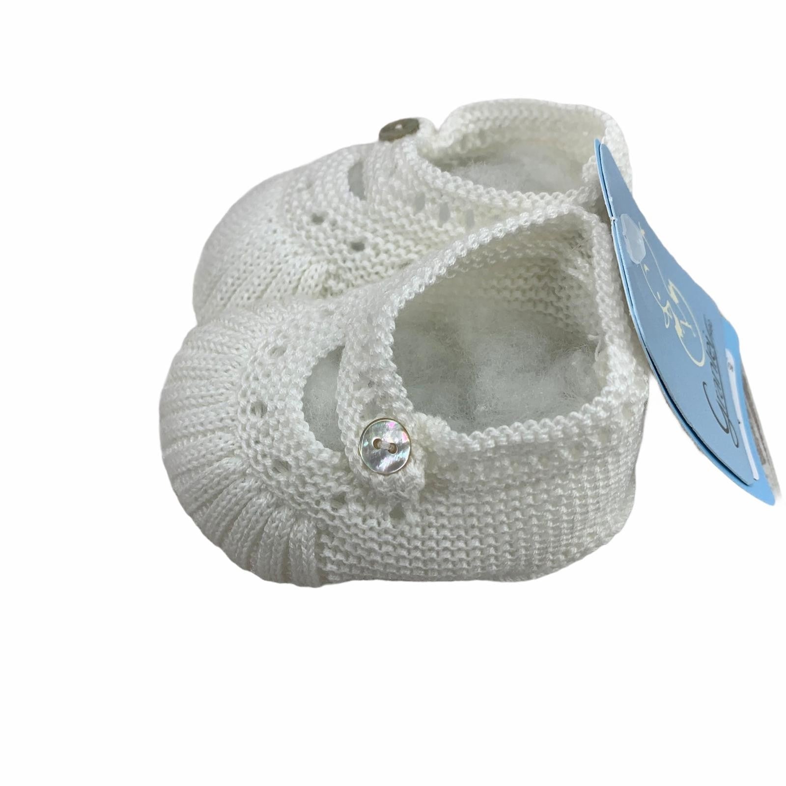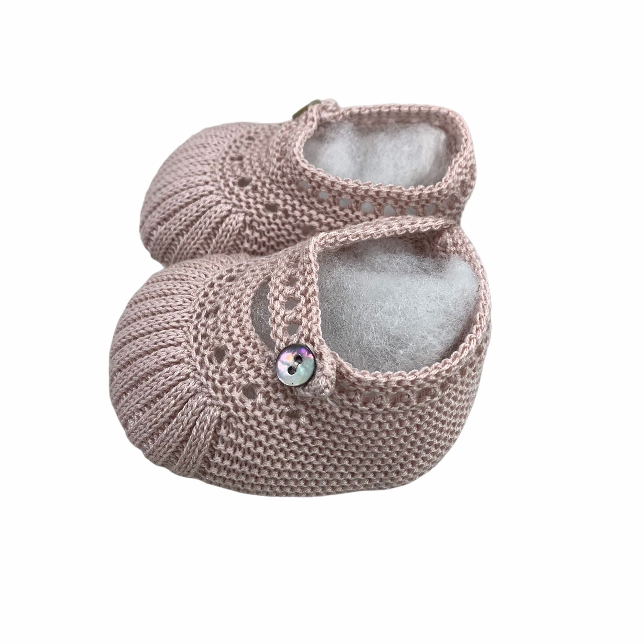 Krippenschuhe aus an den Rändern perforiertem Baumwollfaden, Verschluss mit Perlmuttknöpfen.