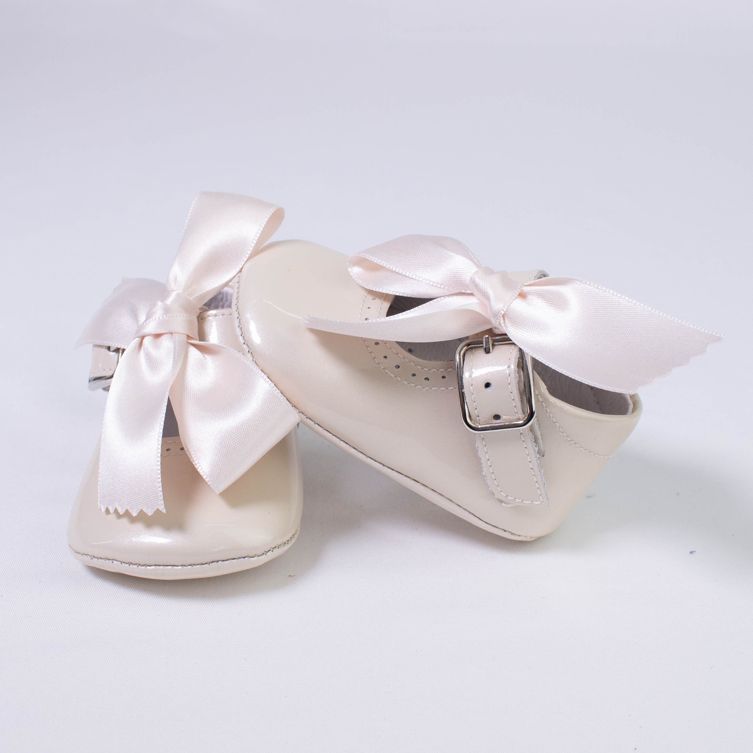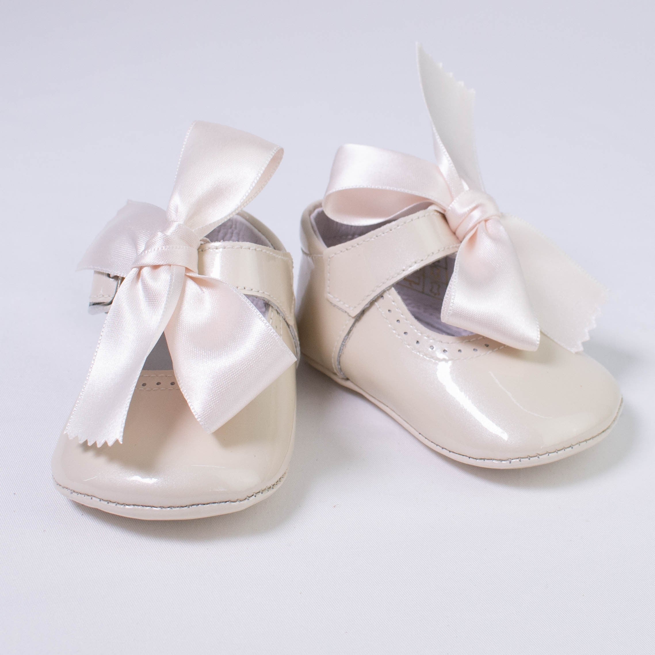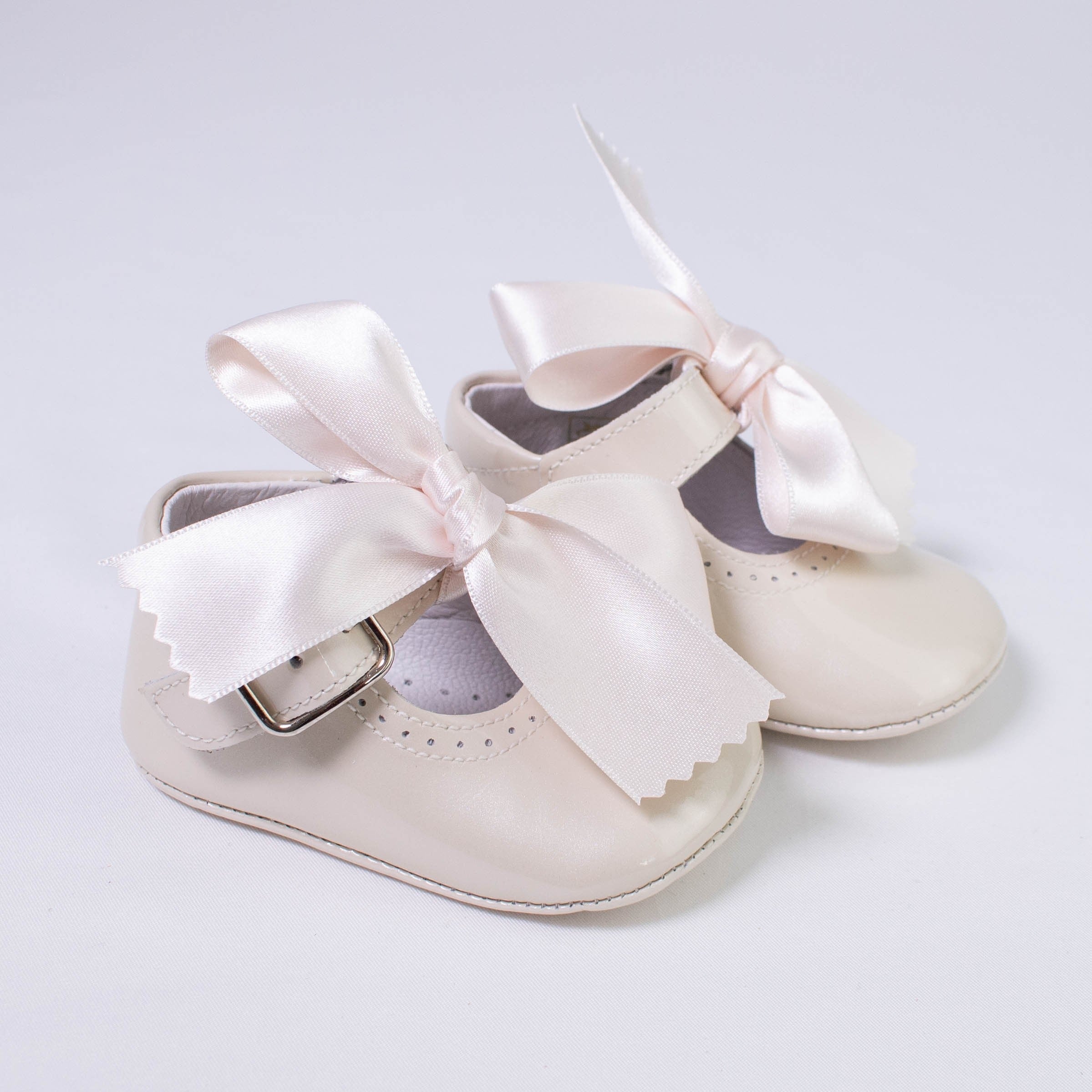 Krippenschuhe aus glänzendem Lackleder. Verschluss mit seitlichem Riemen. Abnehmbarer Bogen.