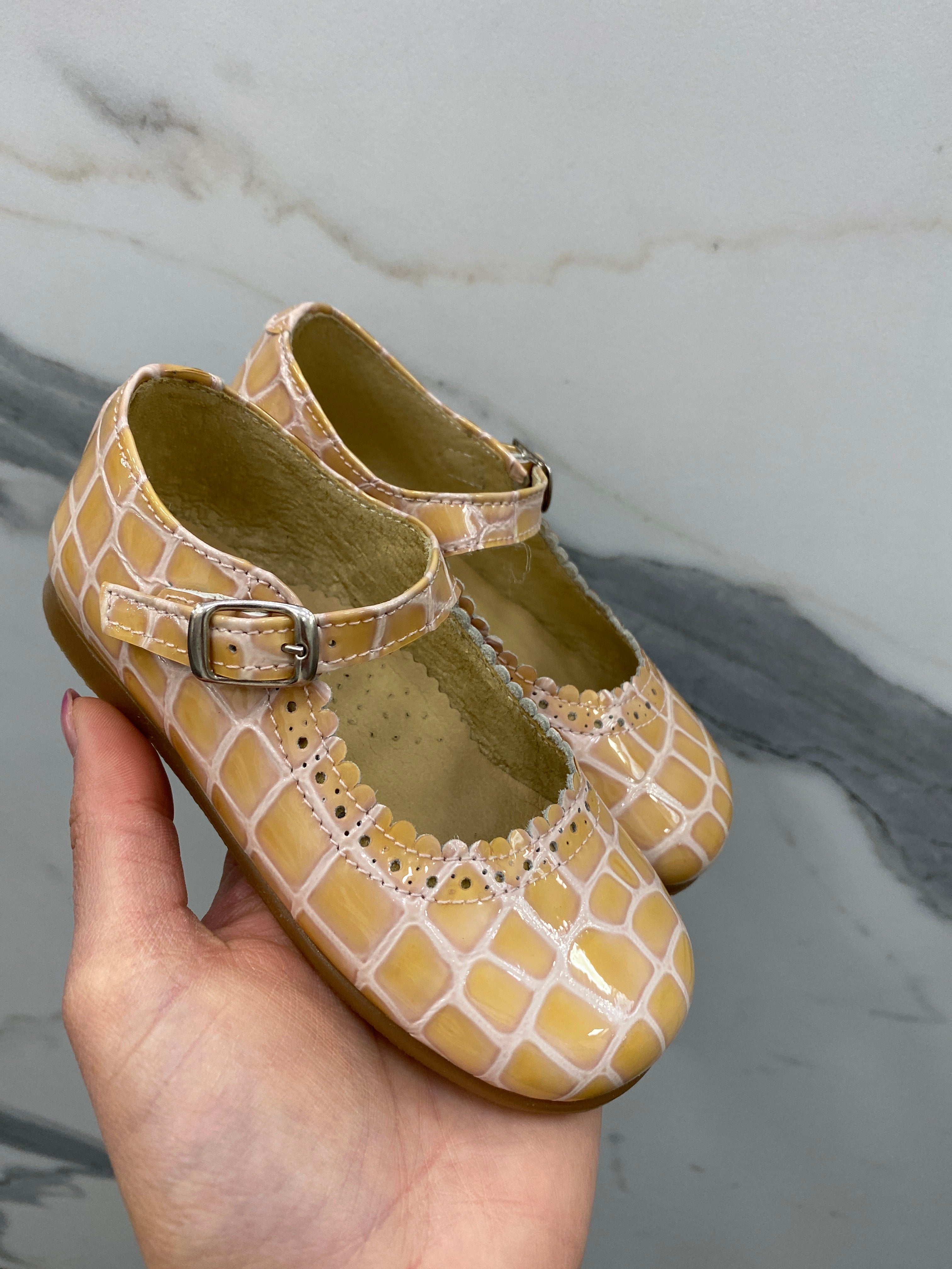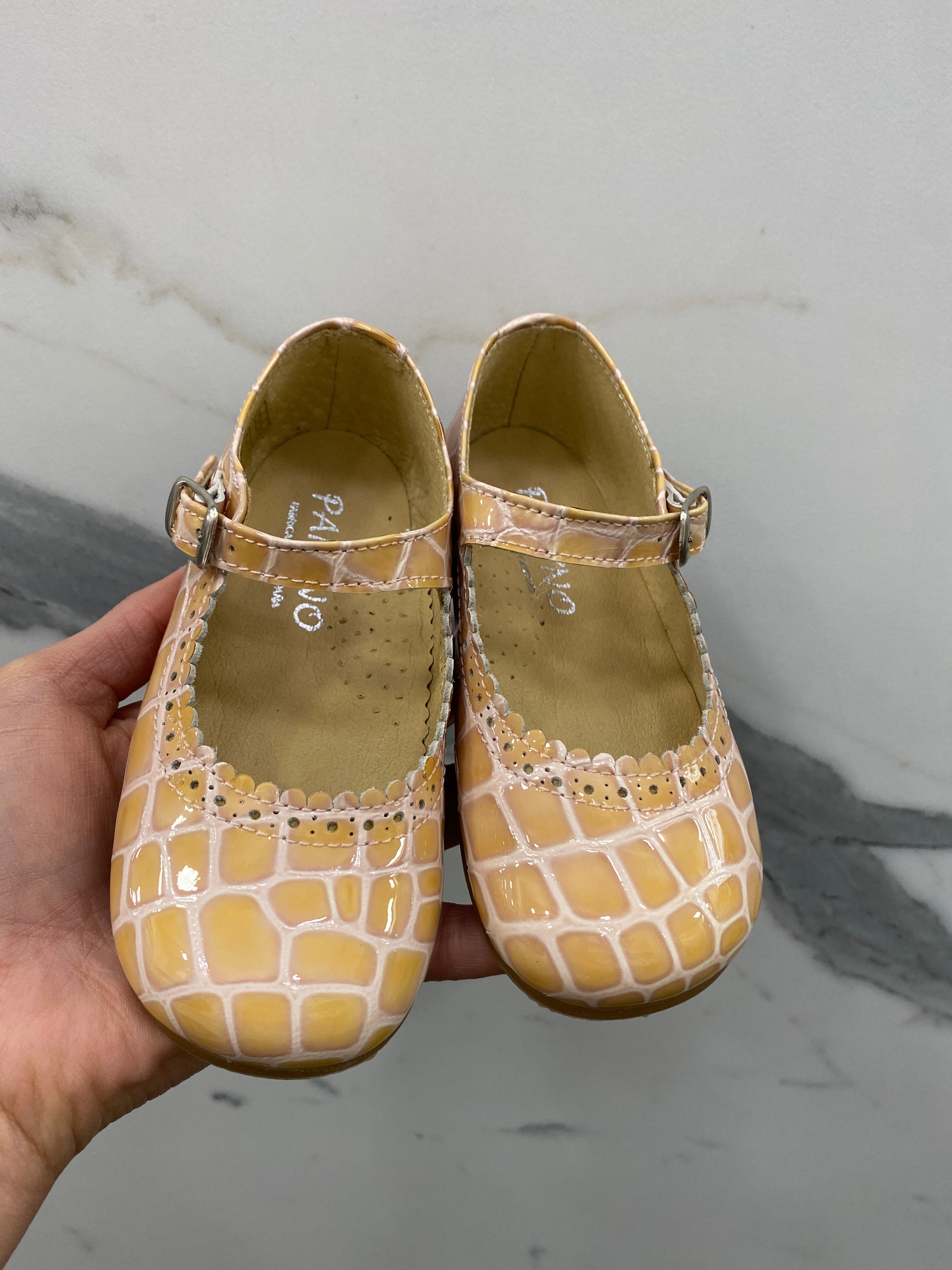 Schuhe für die ersten Schritte aus glänzendem Pythonleder in Rosa.